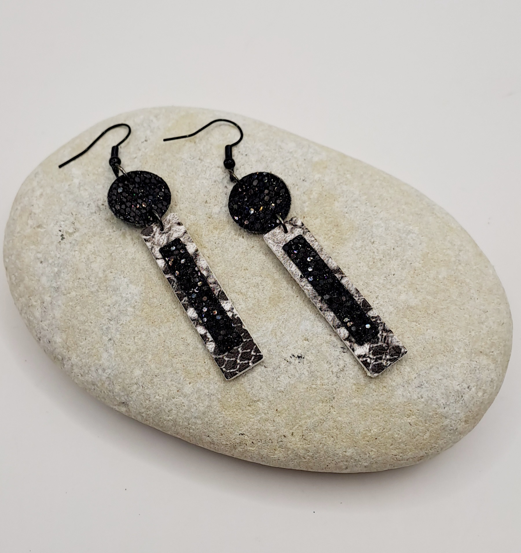 Boucles d’oreilles simili-cuir noir et imprimé / crochet noir