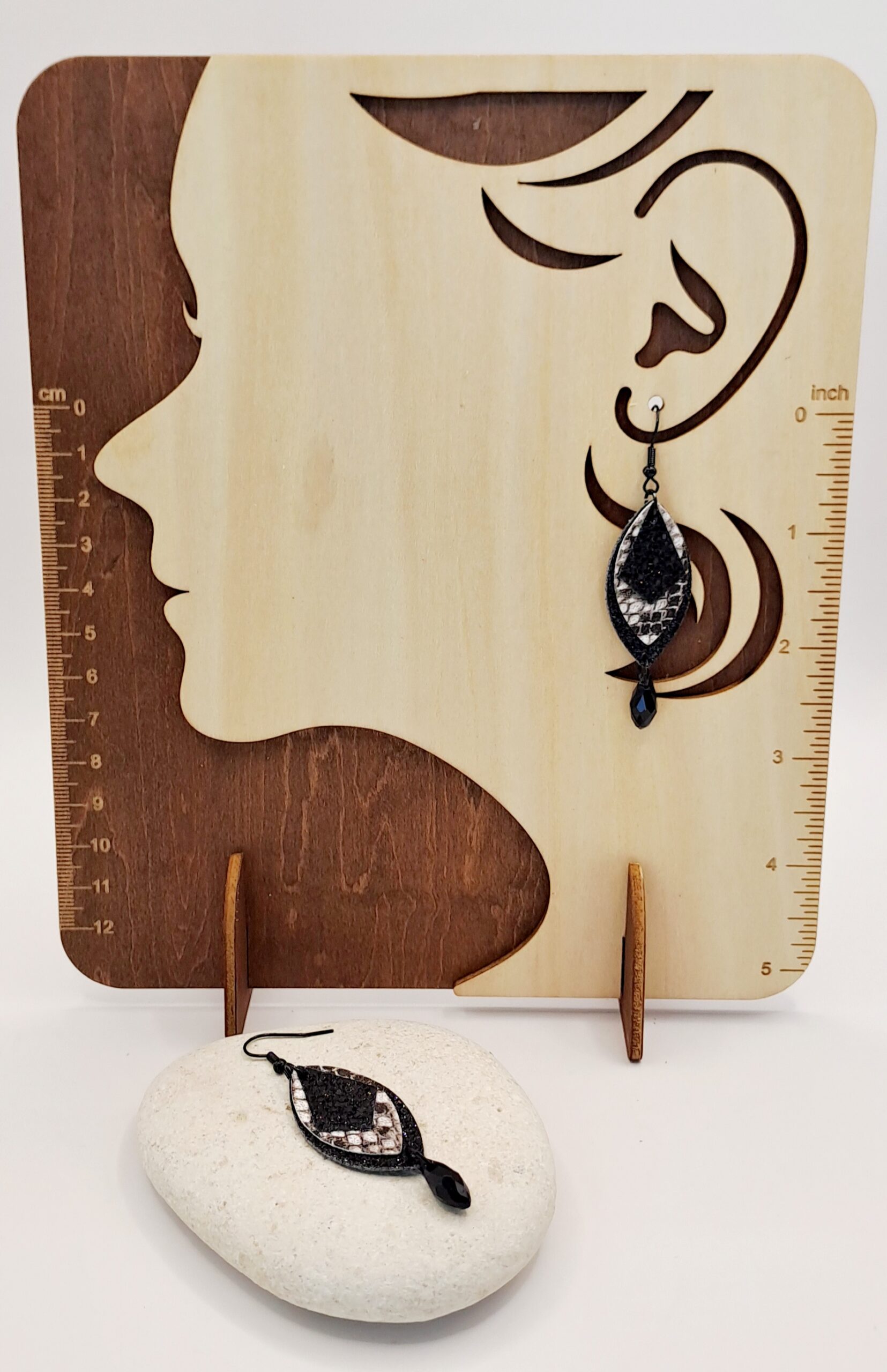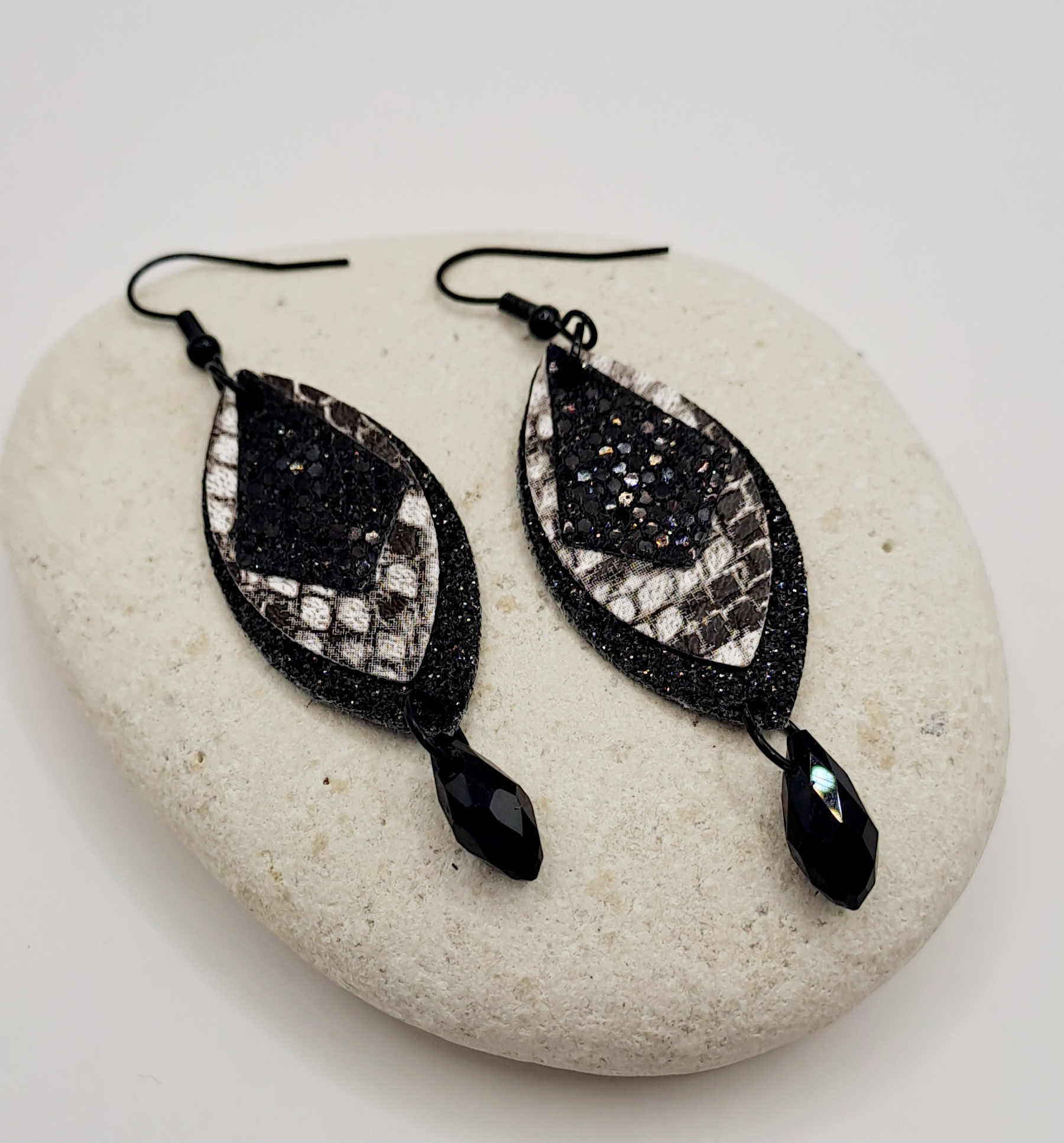 Boules d’oreilles simili-cuir noir / papier imprimé / perle noir / crochet noir