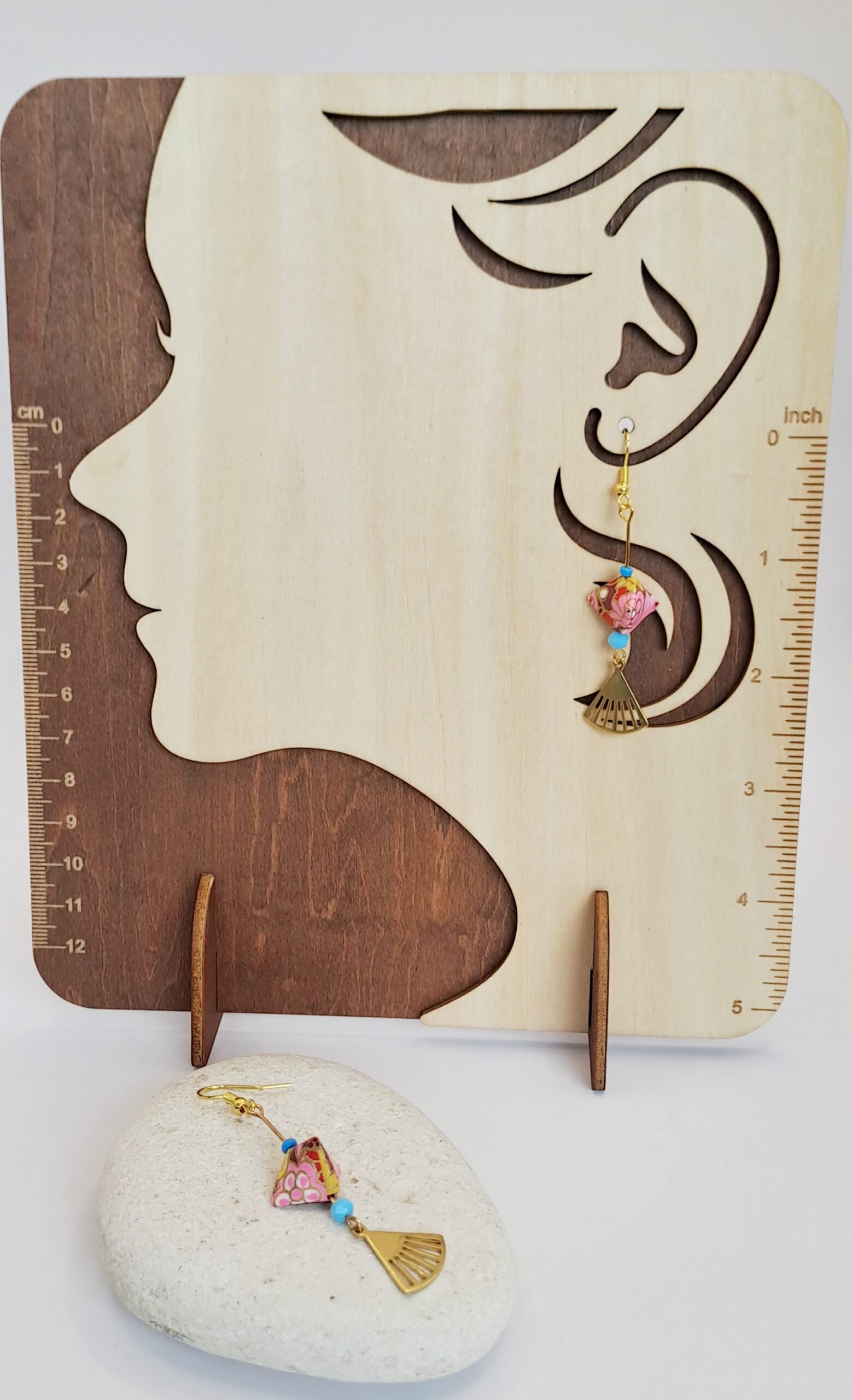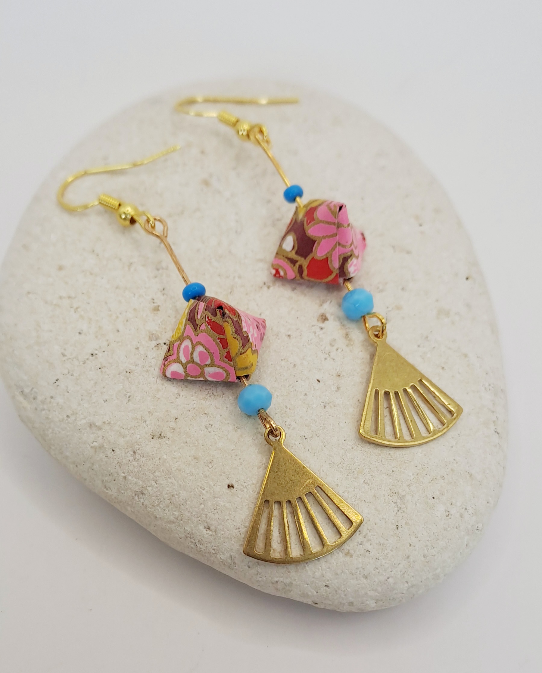 Boucles d’oreilles papier origami imprimé / perle bleu / charme doré / croche or