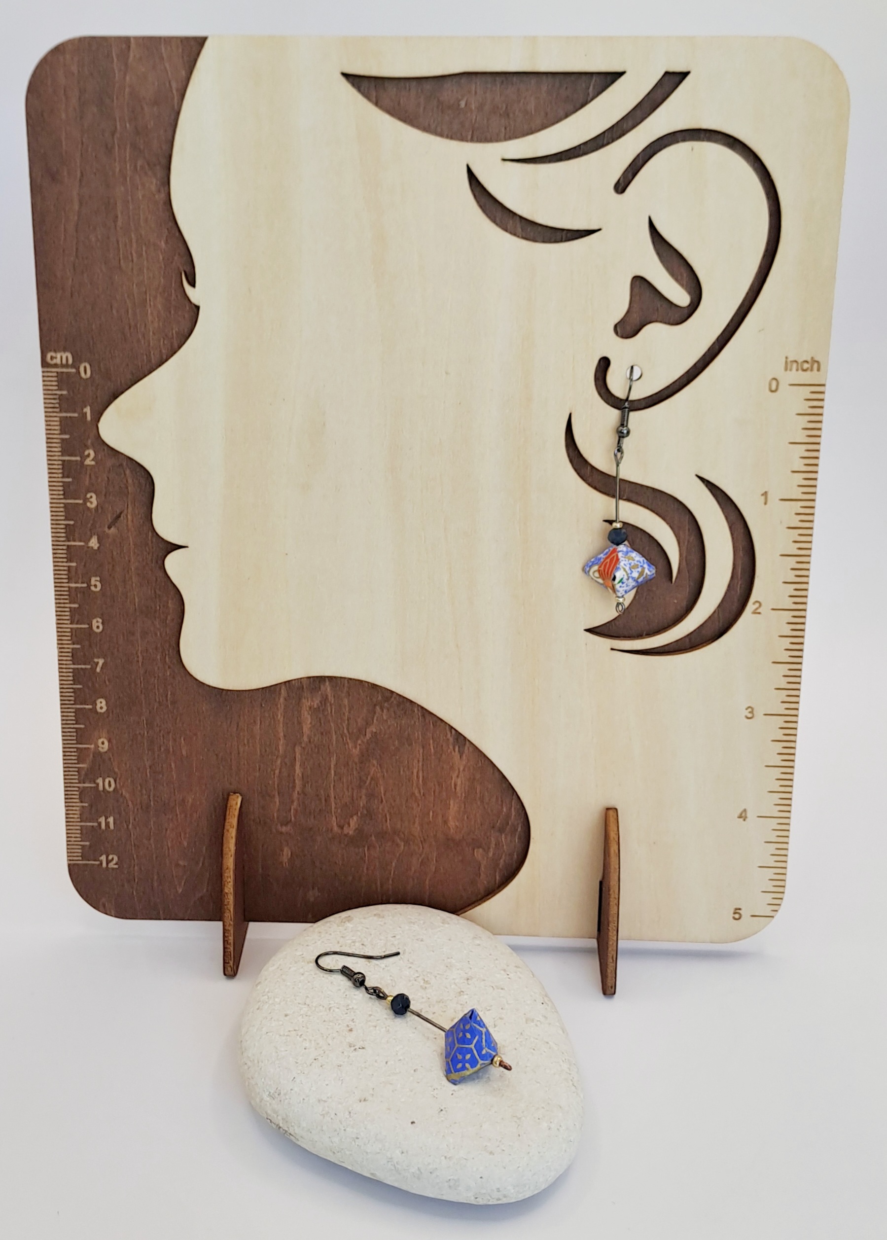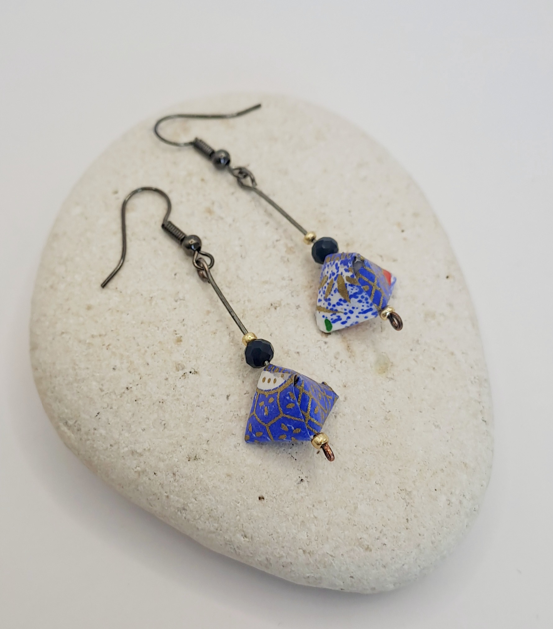 Boucles d’oreilles en papier origami imprimé / perle noir / tige et crochet bronze
