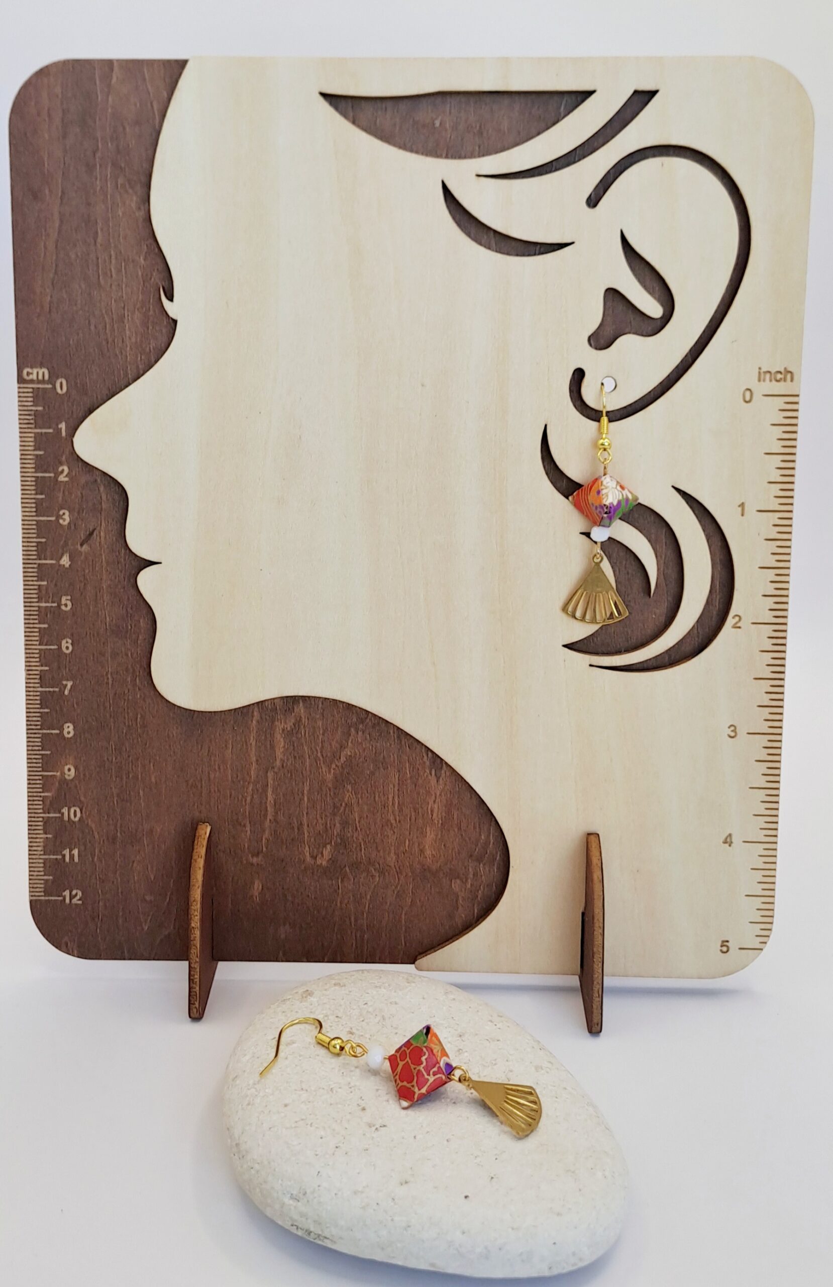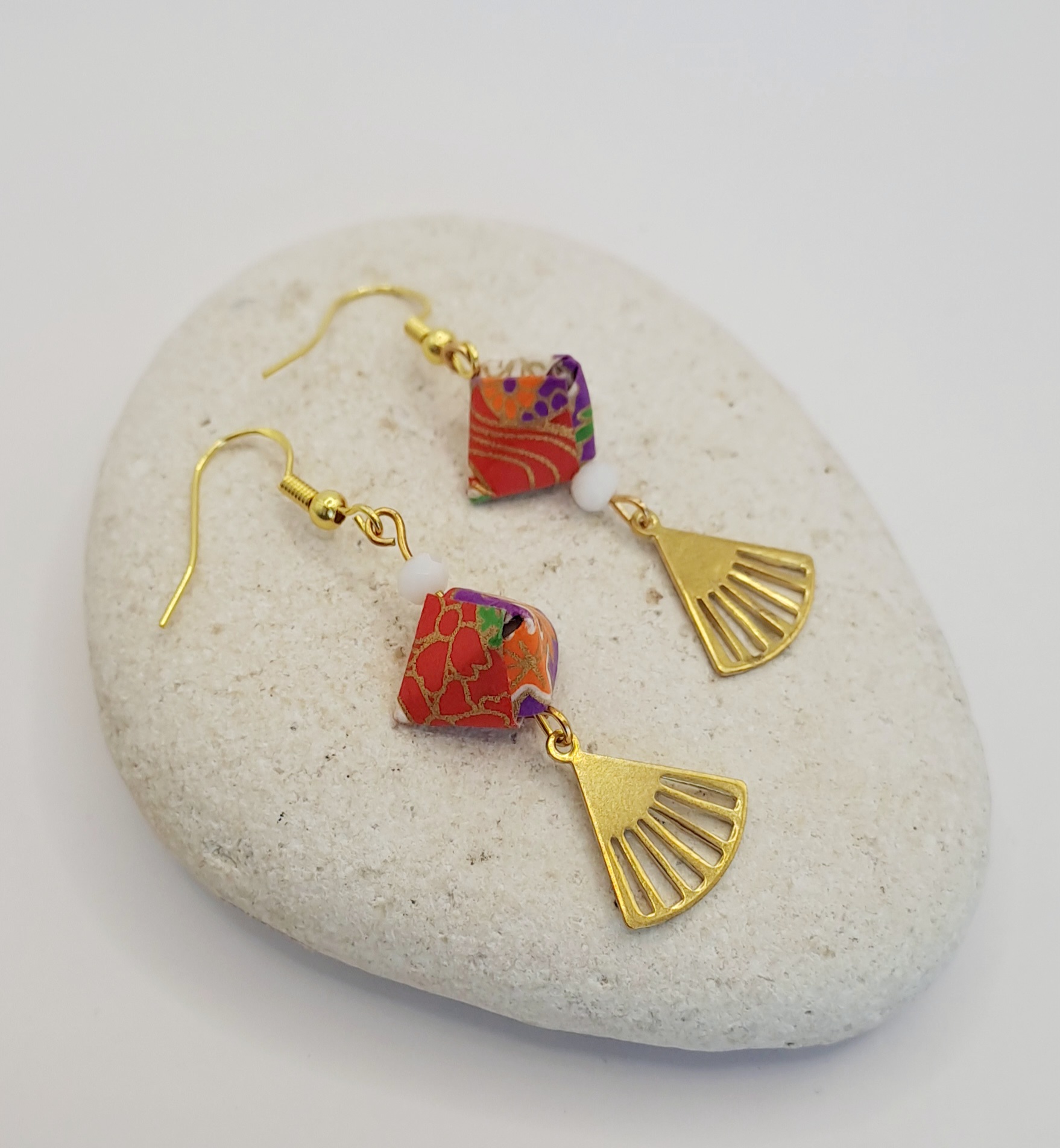 Boucles d’oreilles en papier origami imprimé / perle blanche / charme doré / crochet or