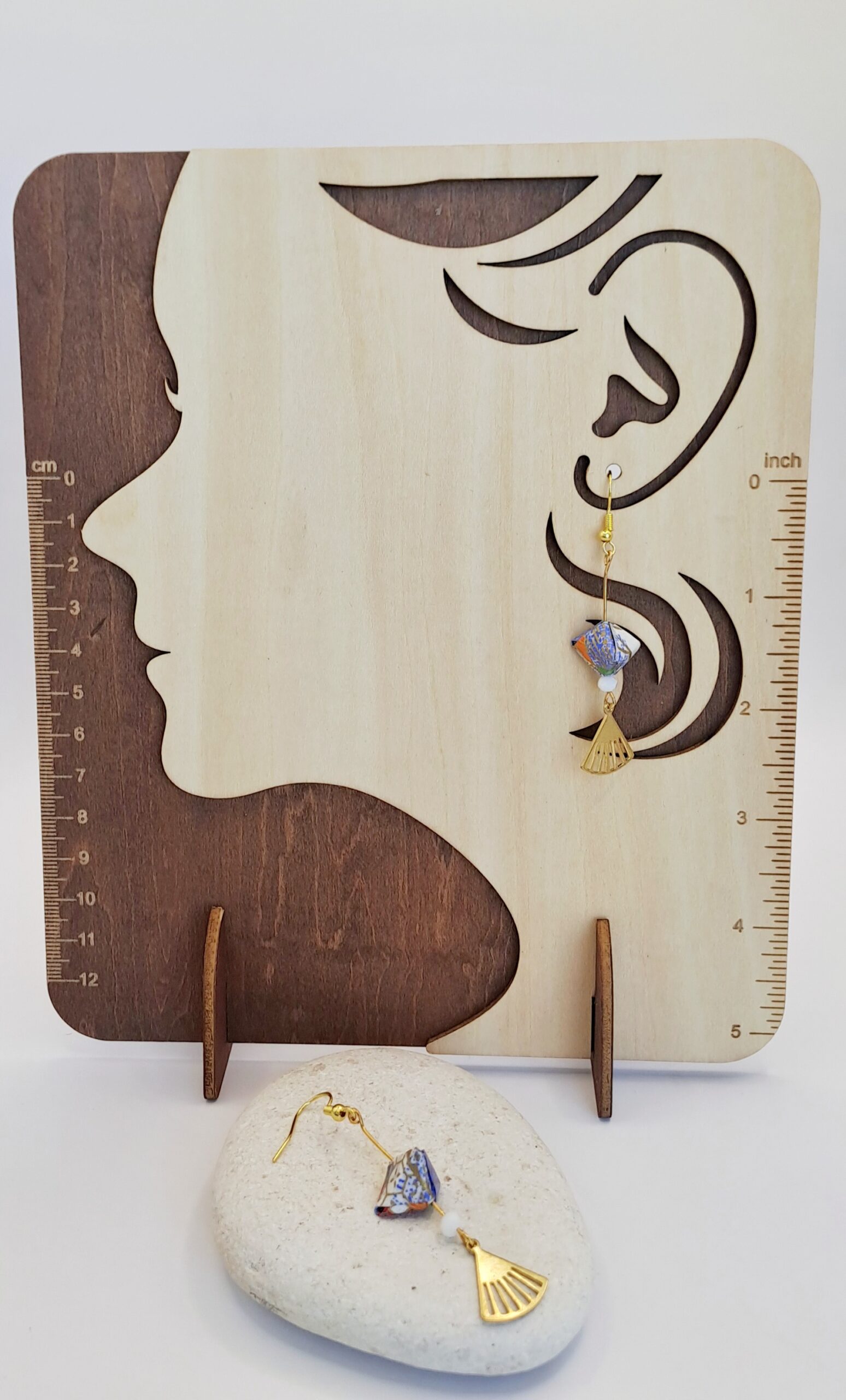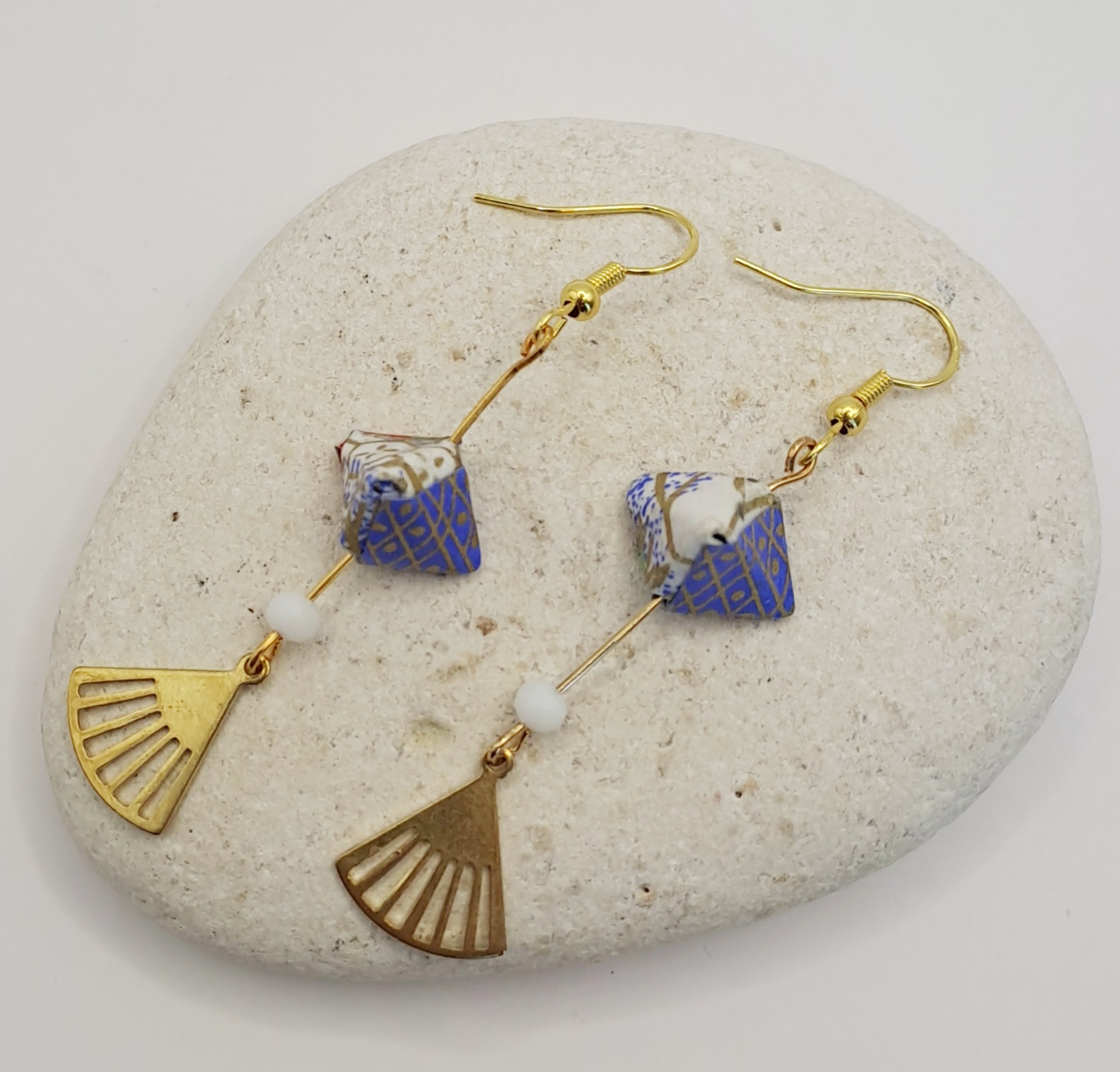 Boucles d’oreilles papier origami imprimé / perle blanche / charme doré / crochet or