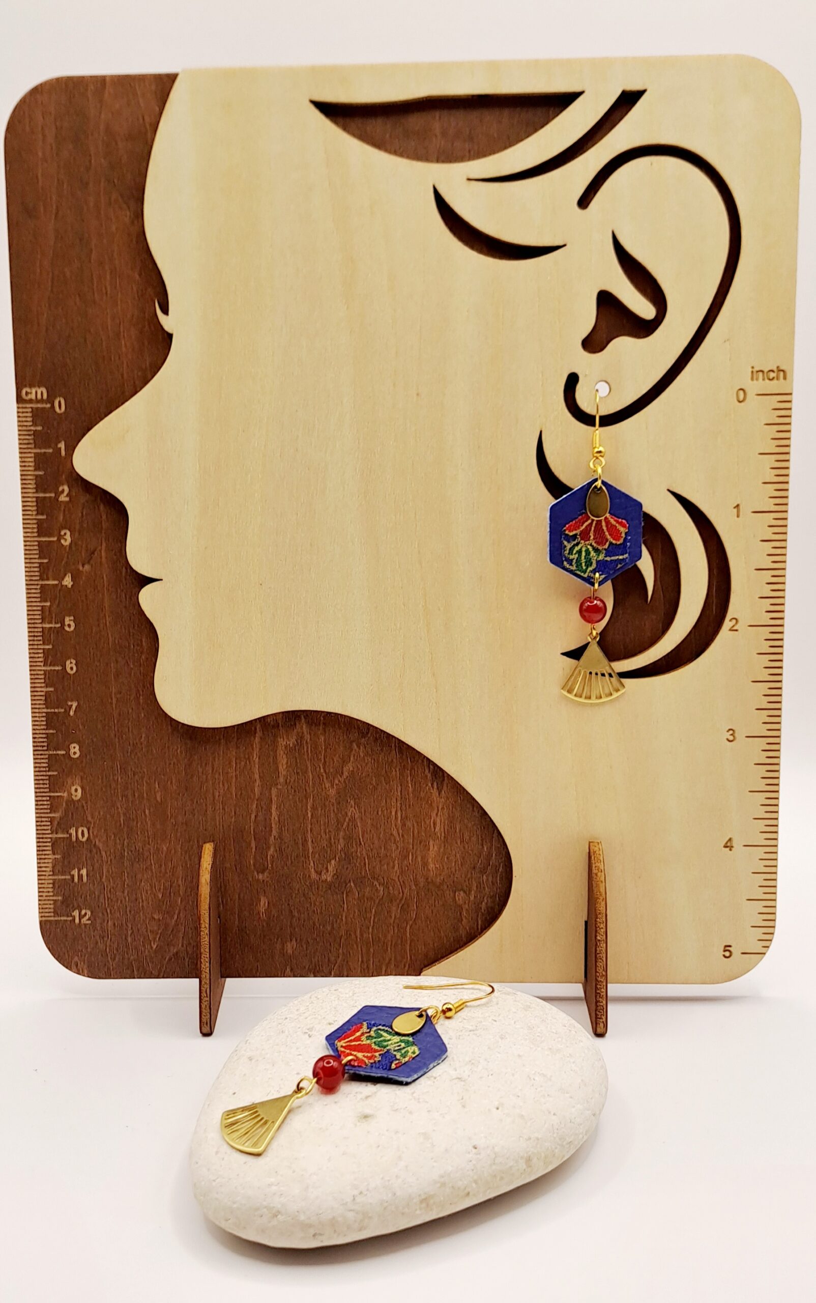Boucles d’oreilles simili-cuir bleu / tissu imprimé / charme doré / perle rouge / crochet or