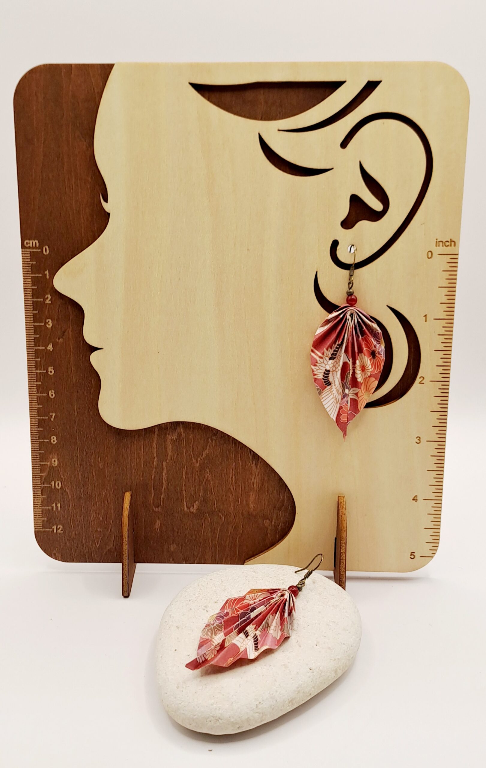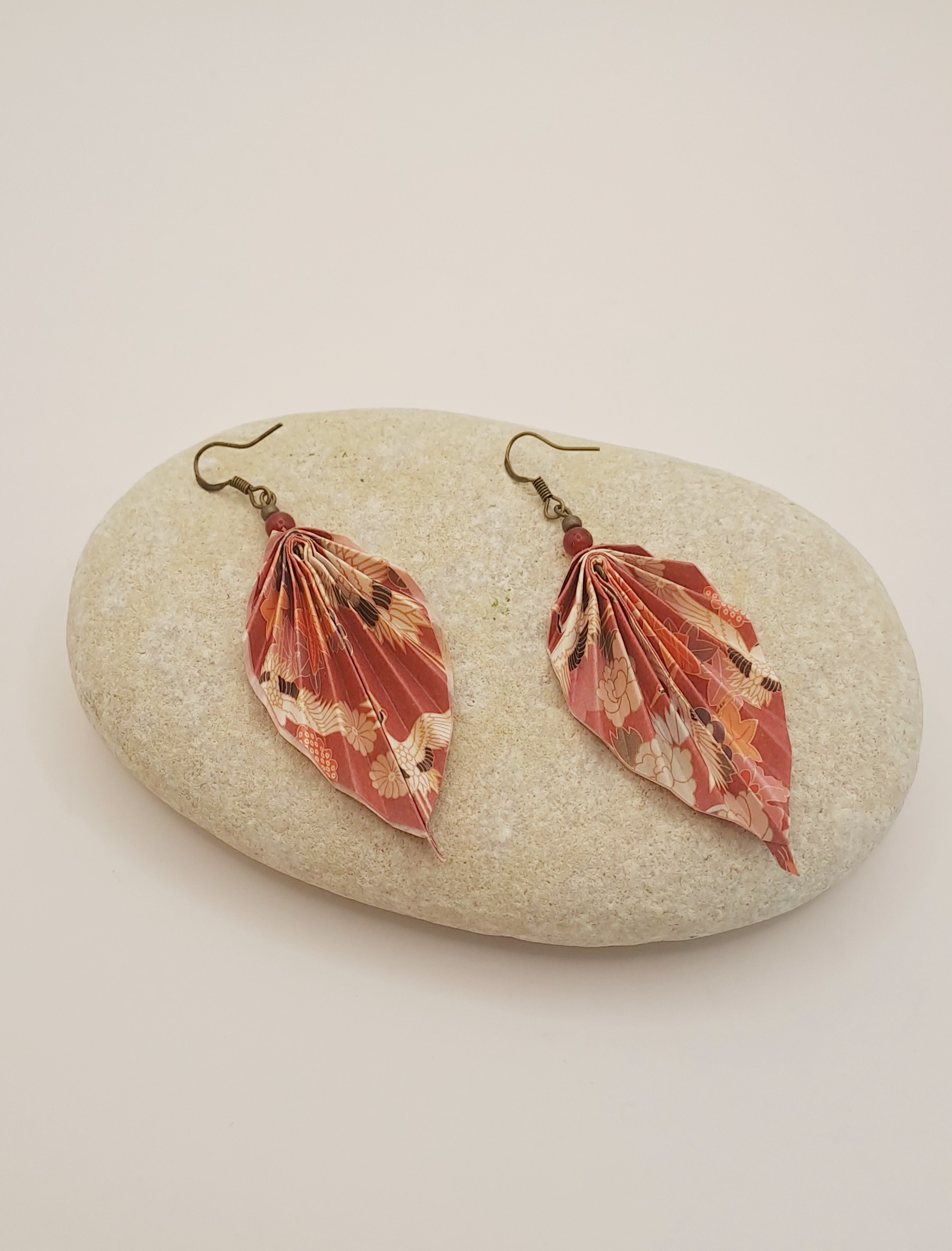 Boucles d’oreilles papier imprimé dur / perle rouge