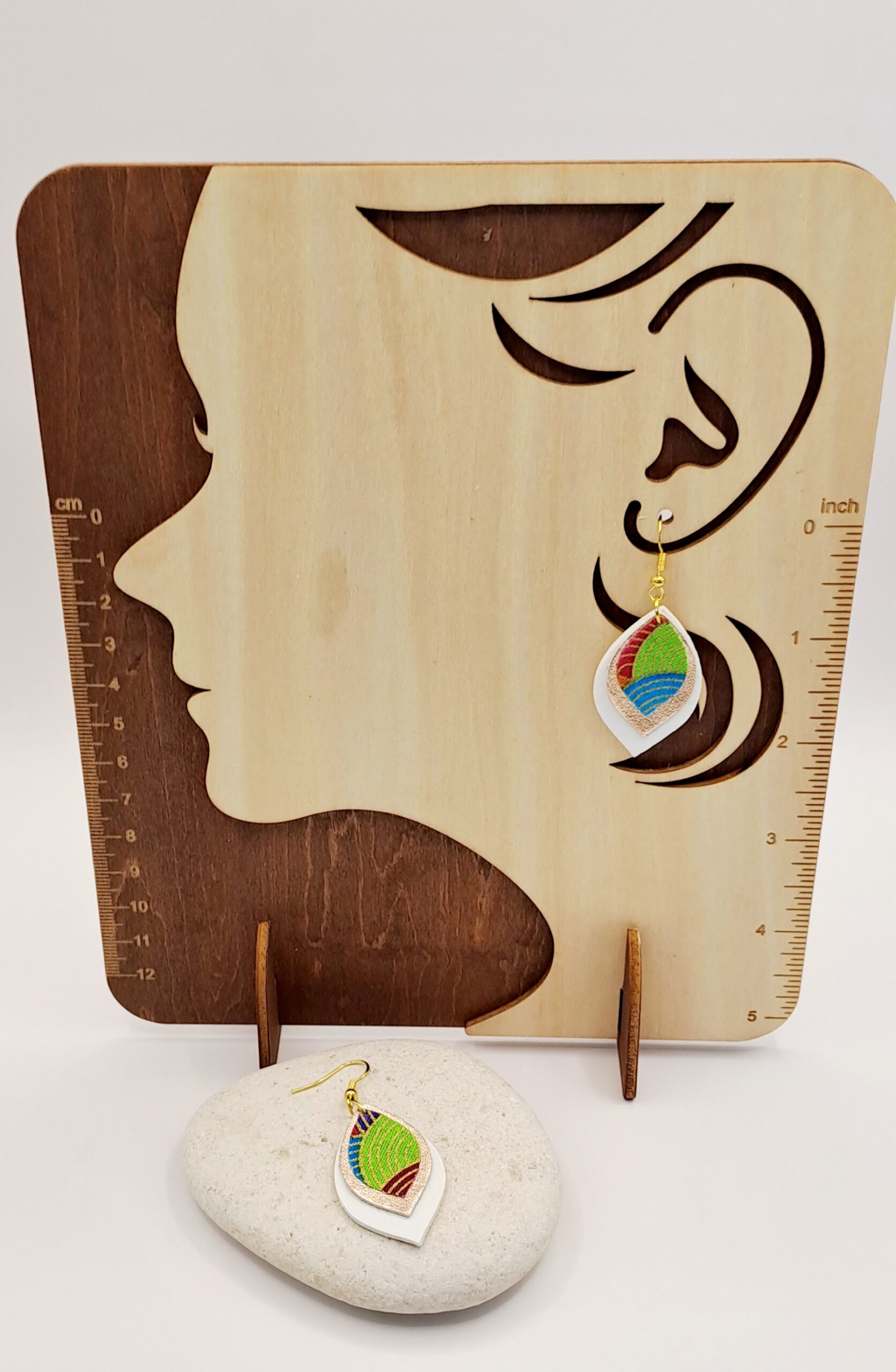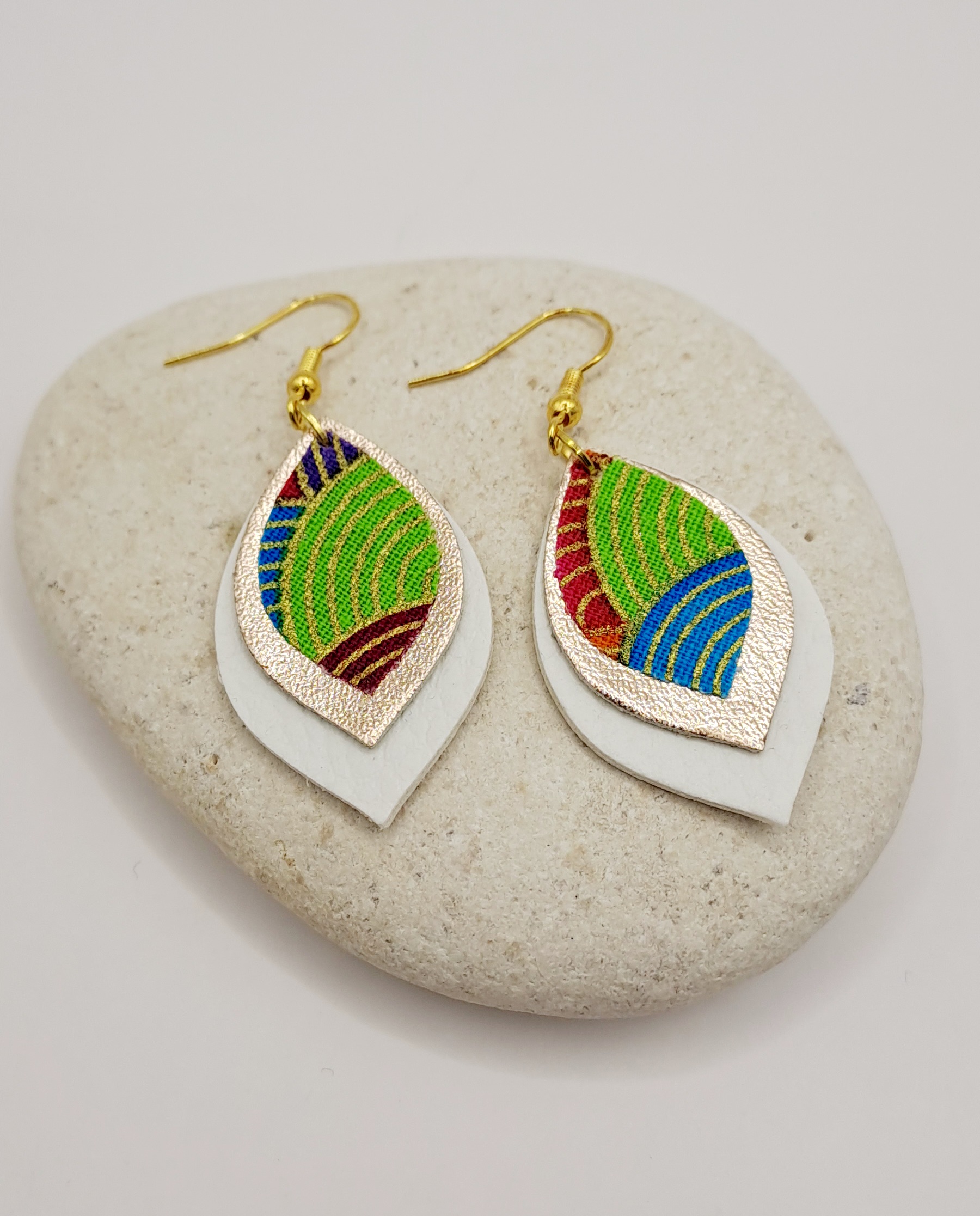 Boucles d’oreilles simili-cuir blanc et doré / tissu imprimé / crochet or