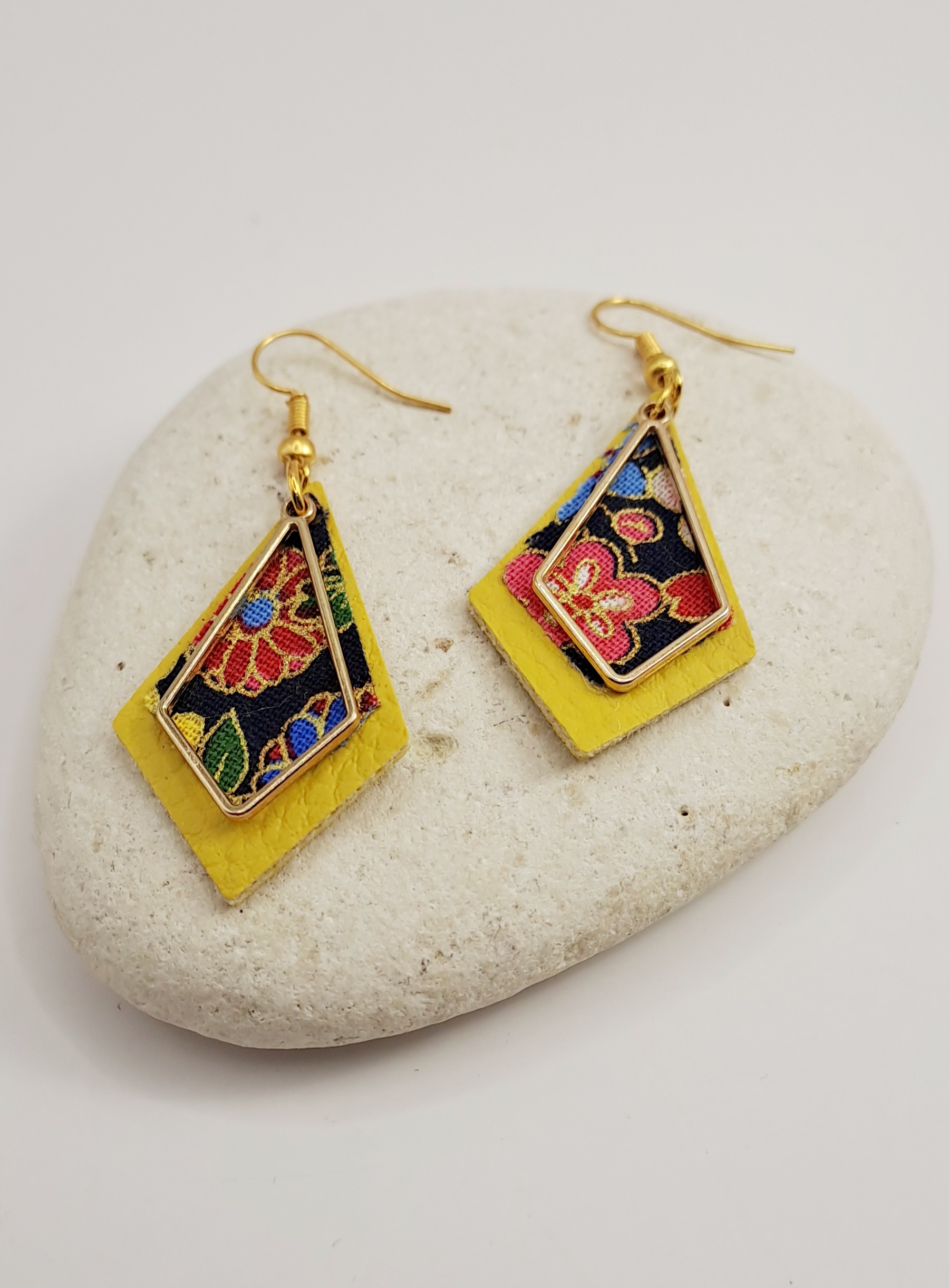 Boucles d’oreilles simili cuir jaune / tissu imprimé / charme doré / crochet or