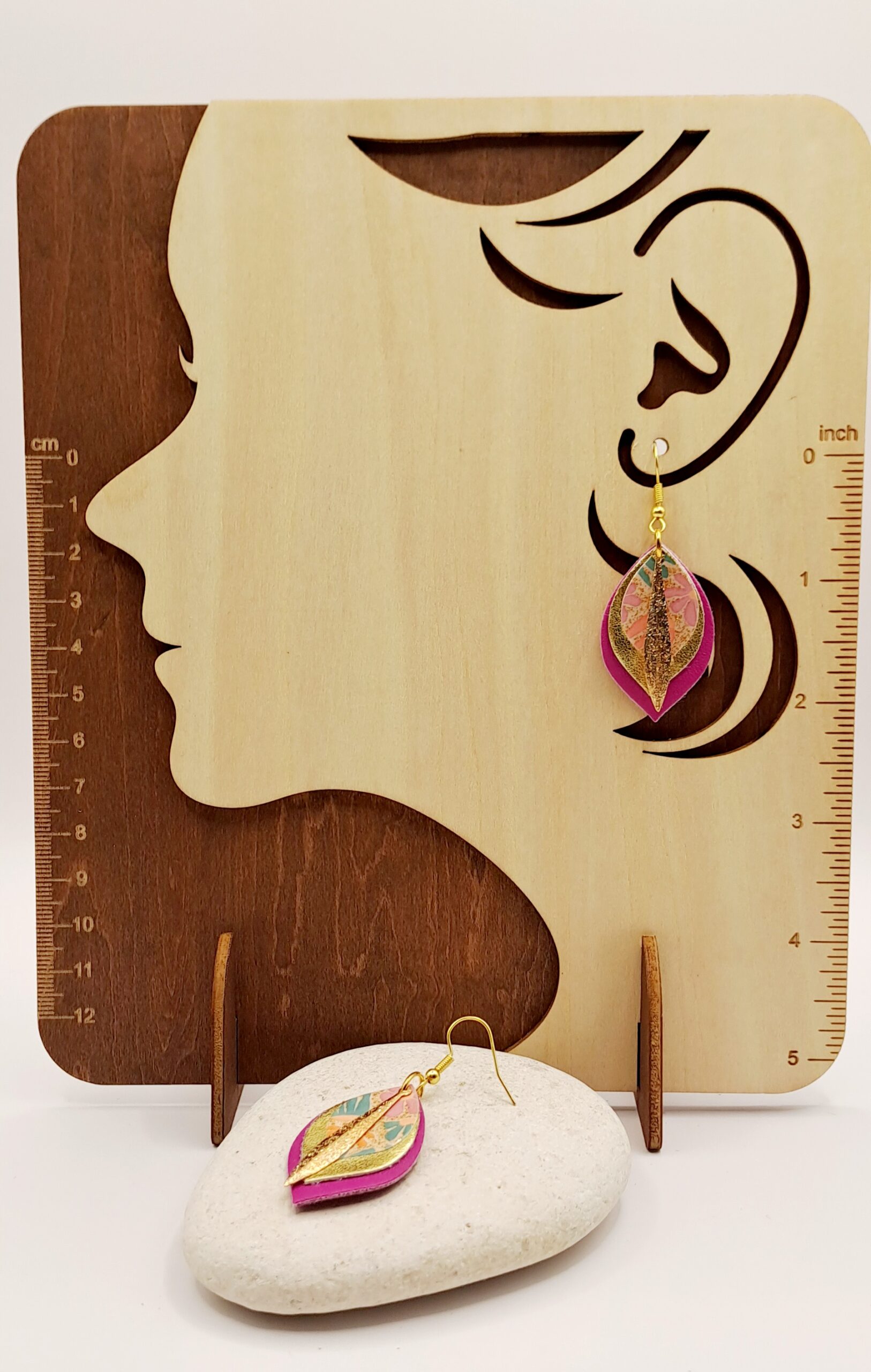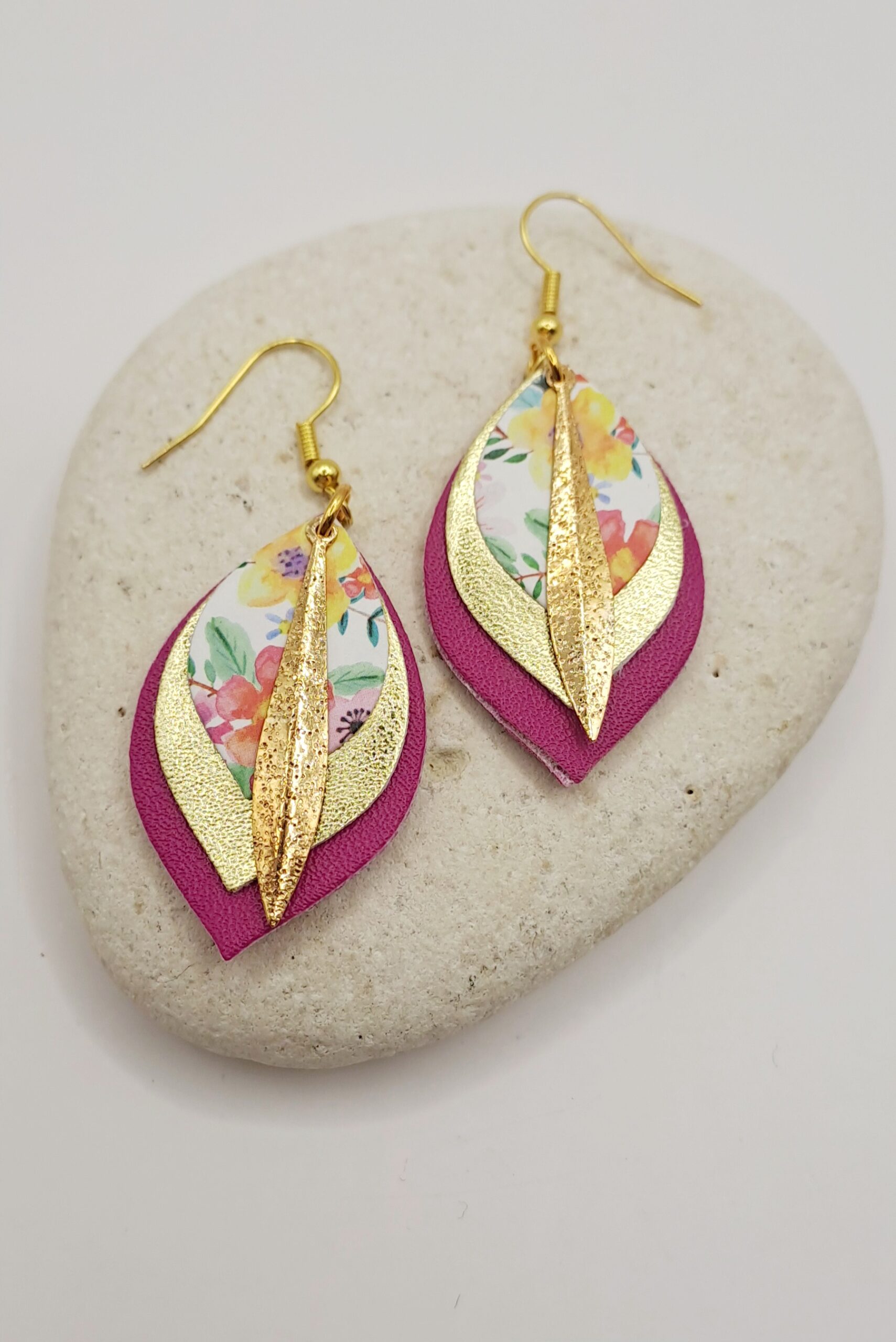 Boucles d’oreilles simili-cuir rose et doré / papier imprimé / charme doré / crochet or