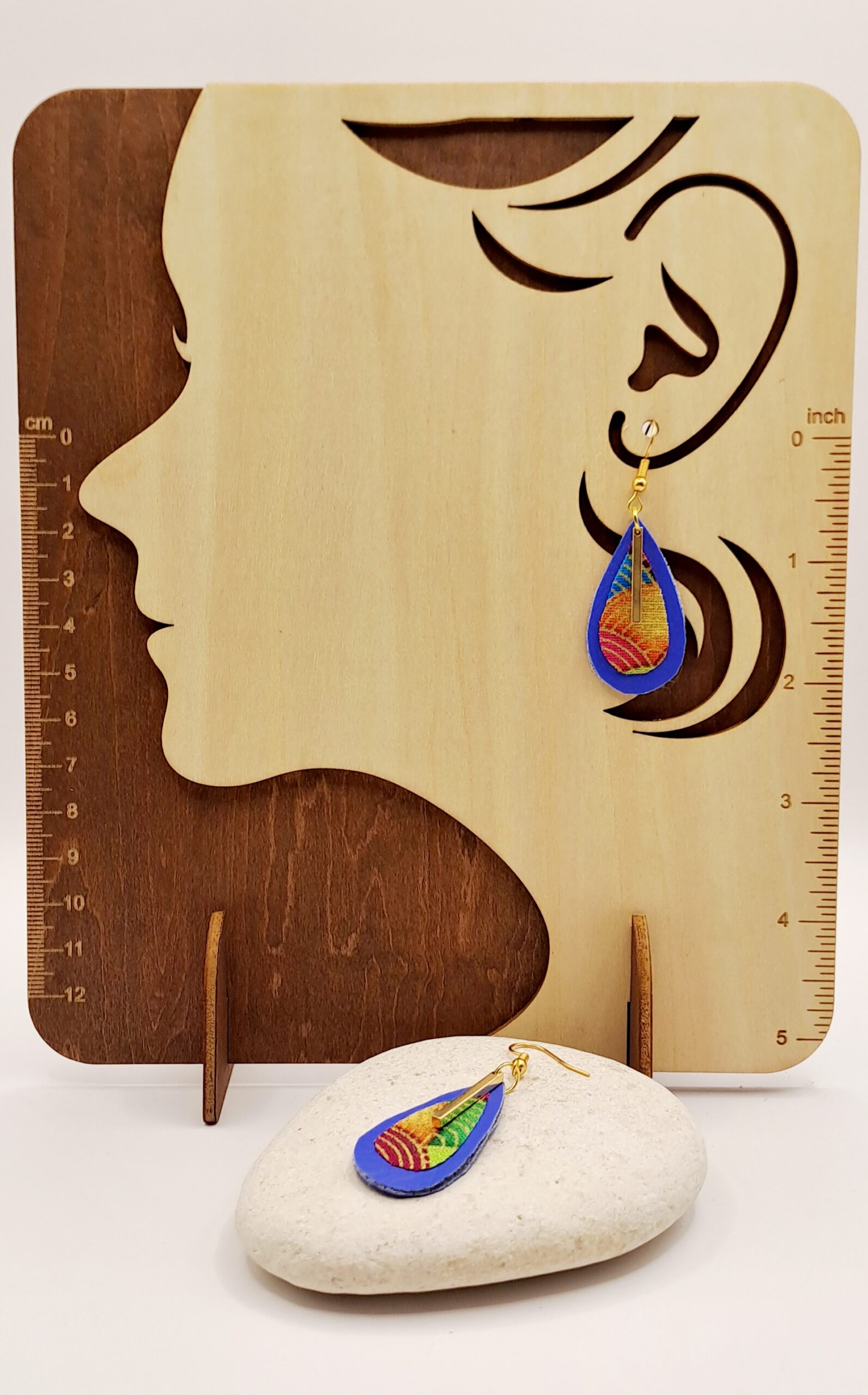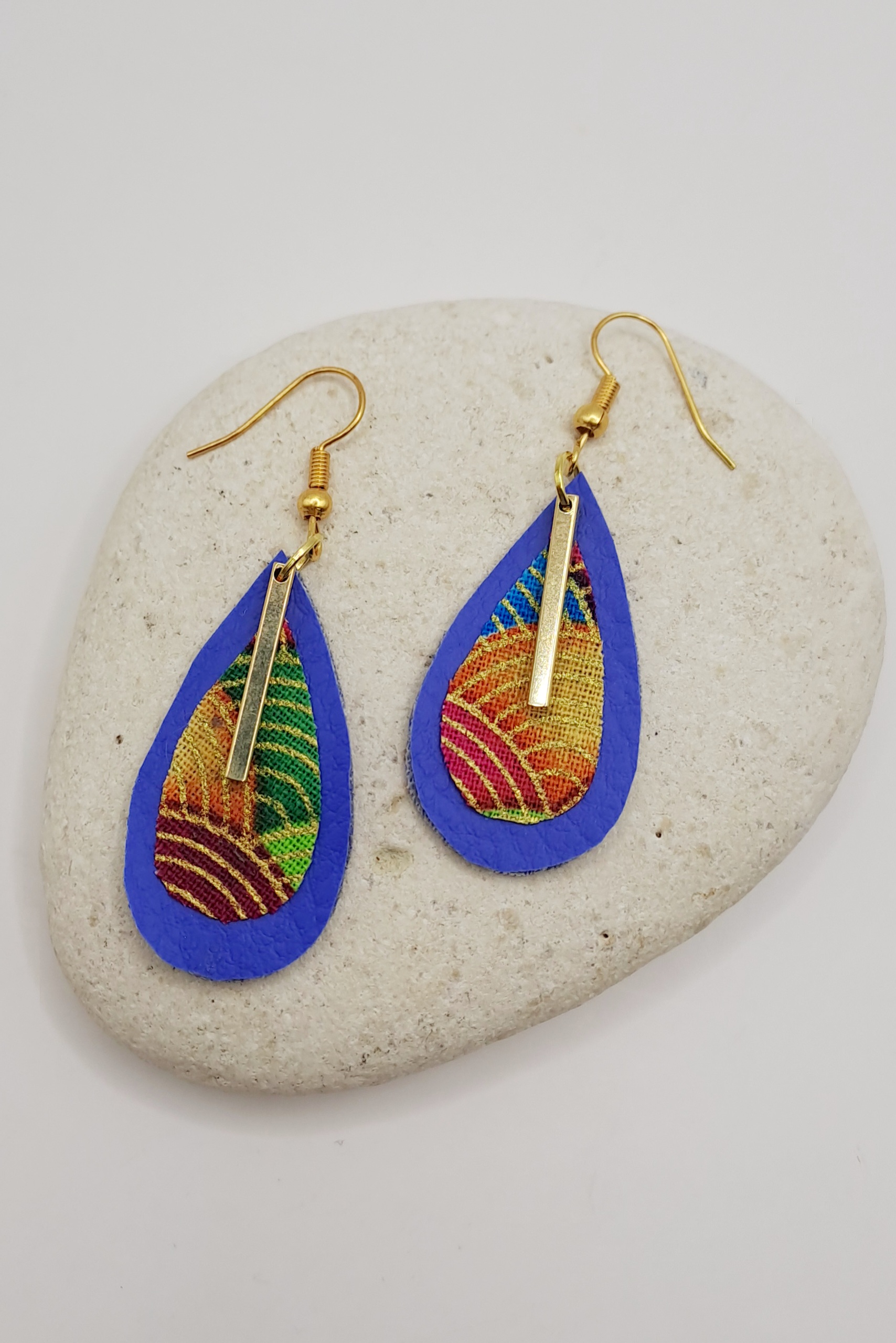 Boucles d’oreilles simili-cuir bleu / tissu imprimé / charme doré / crochet or