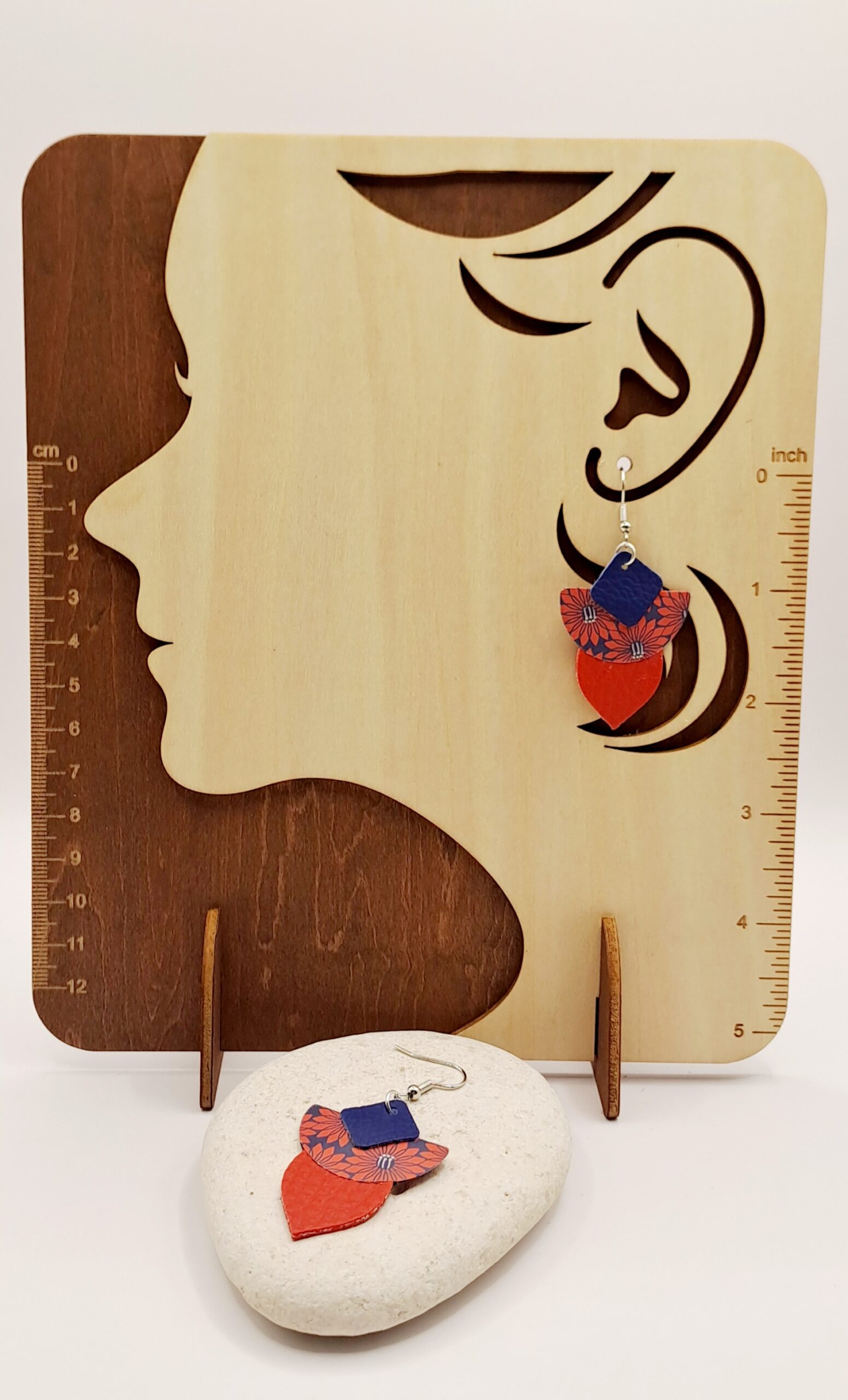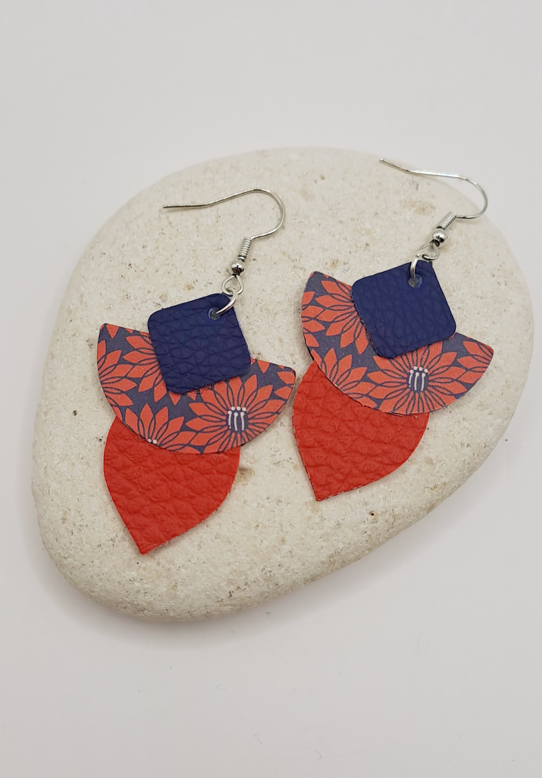 Boucles d’oreilles simili-cuir rouge et bleu / papier dur imprimé / crochet argent