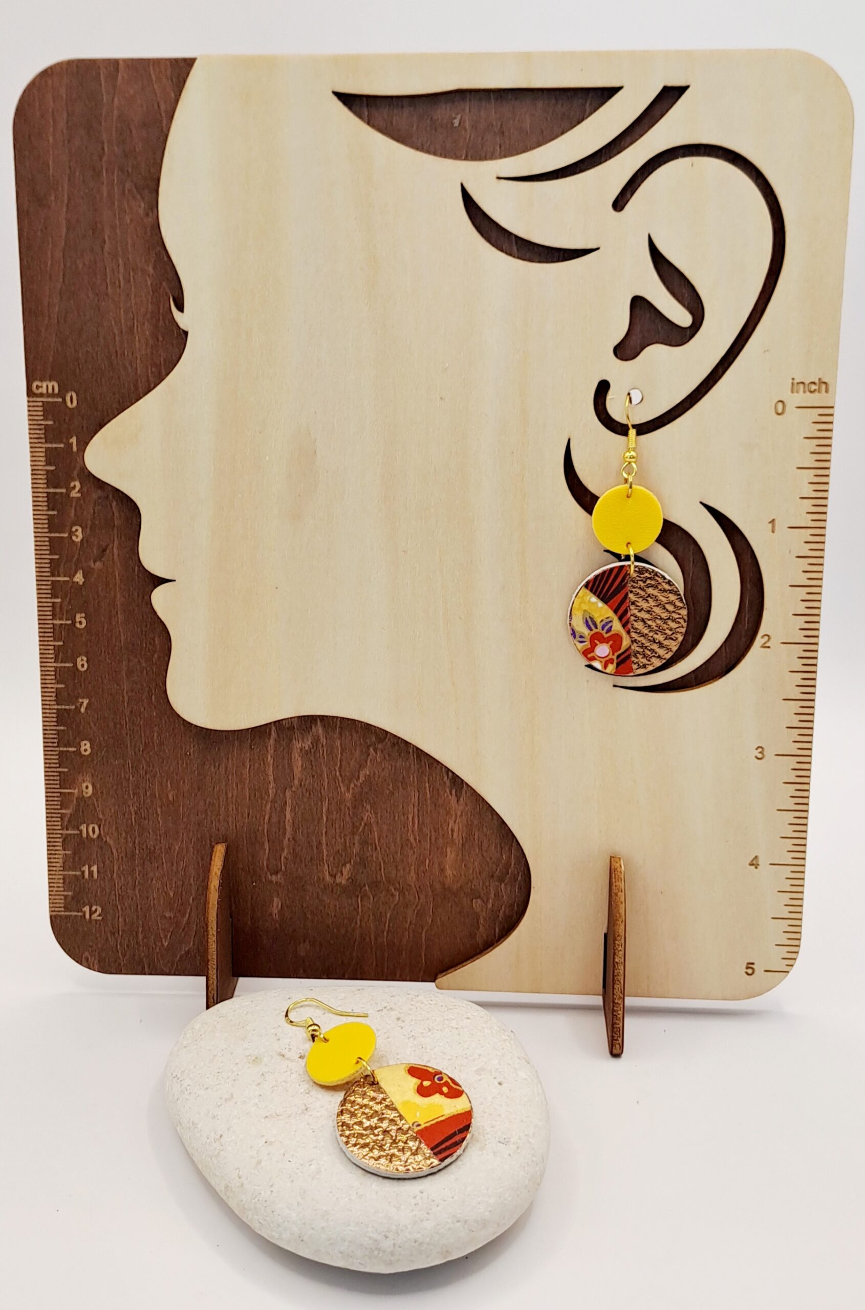 Boucles d’oreilles simili-cuir doré et jaune / papier imprimé / crochet or