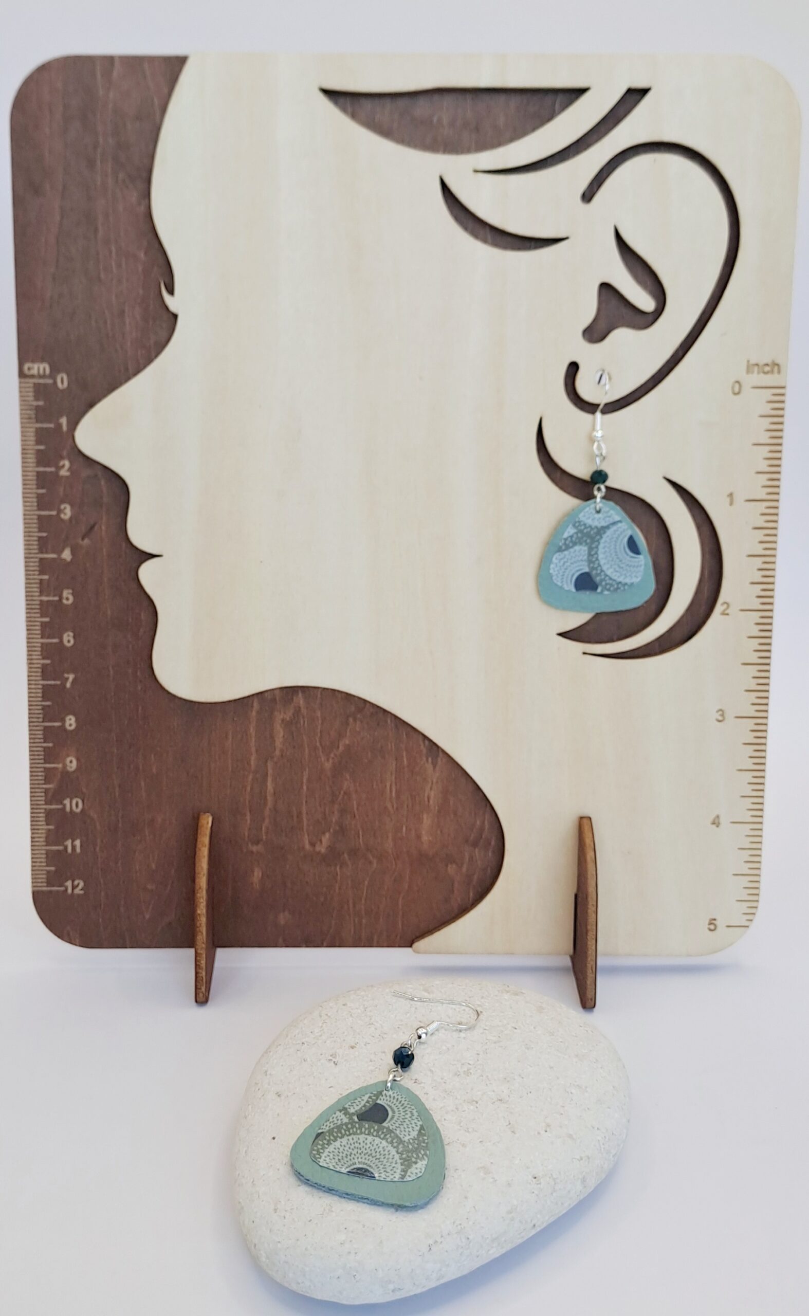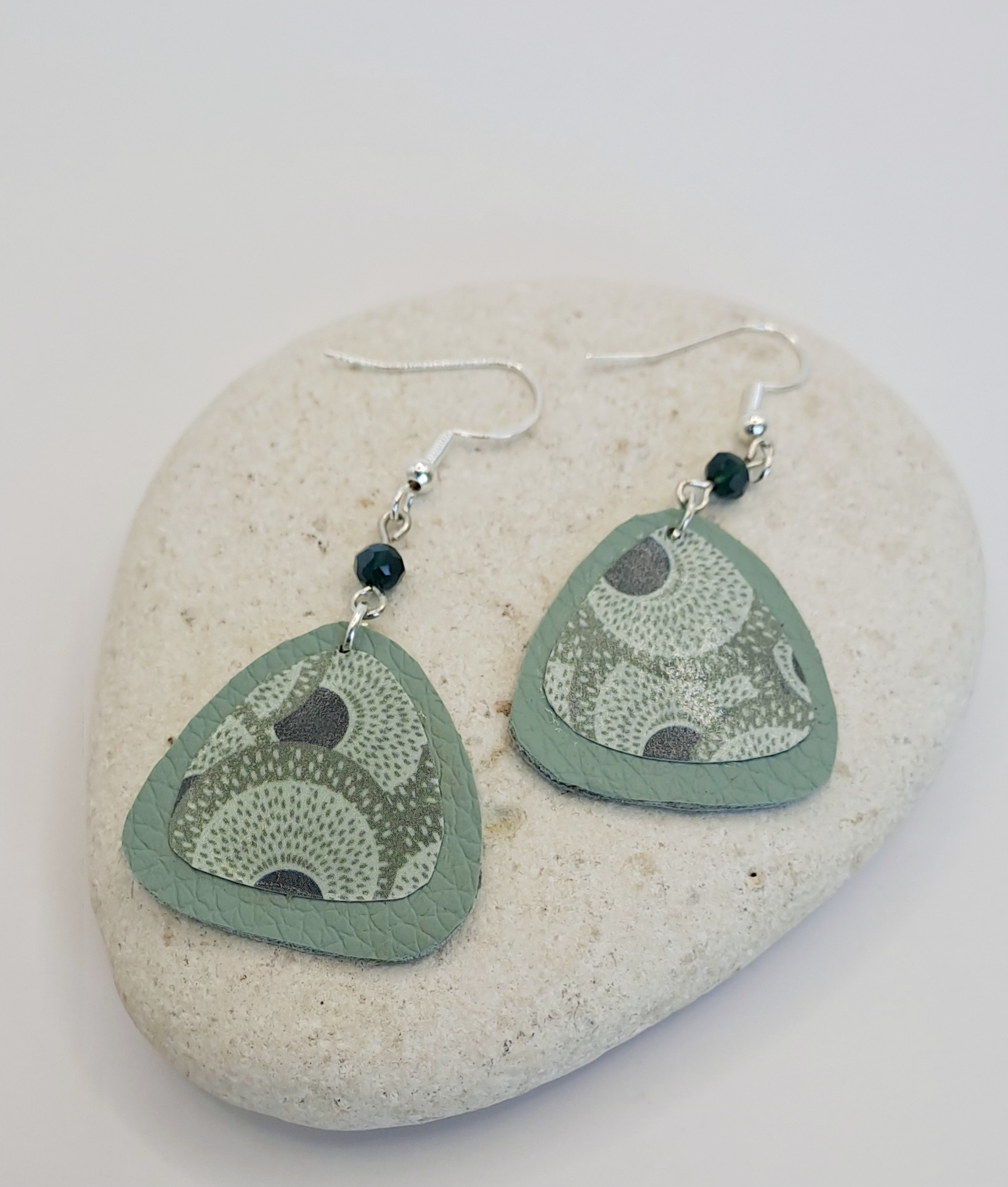 Boucles d’oreilles simili-cuir vert clair / papier imprimé / perle verte / crochet argent