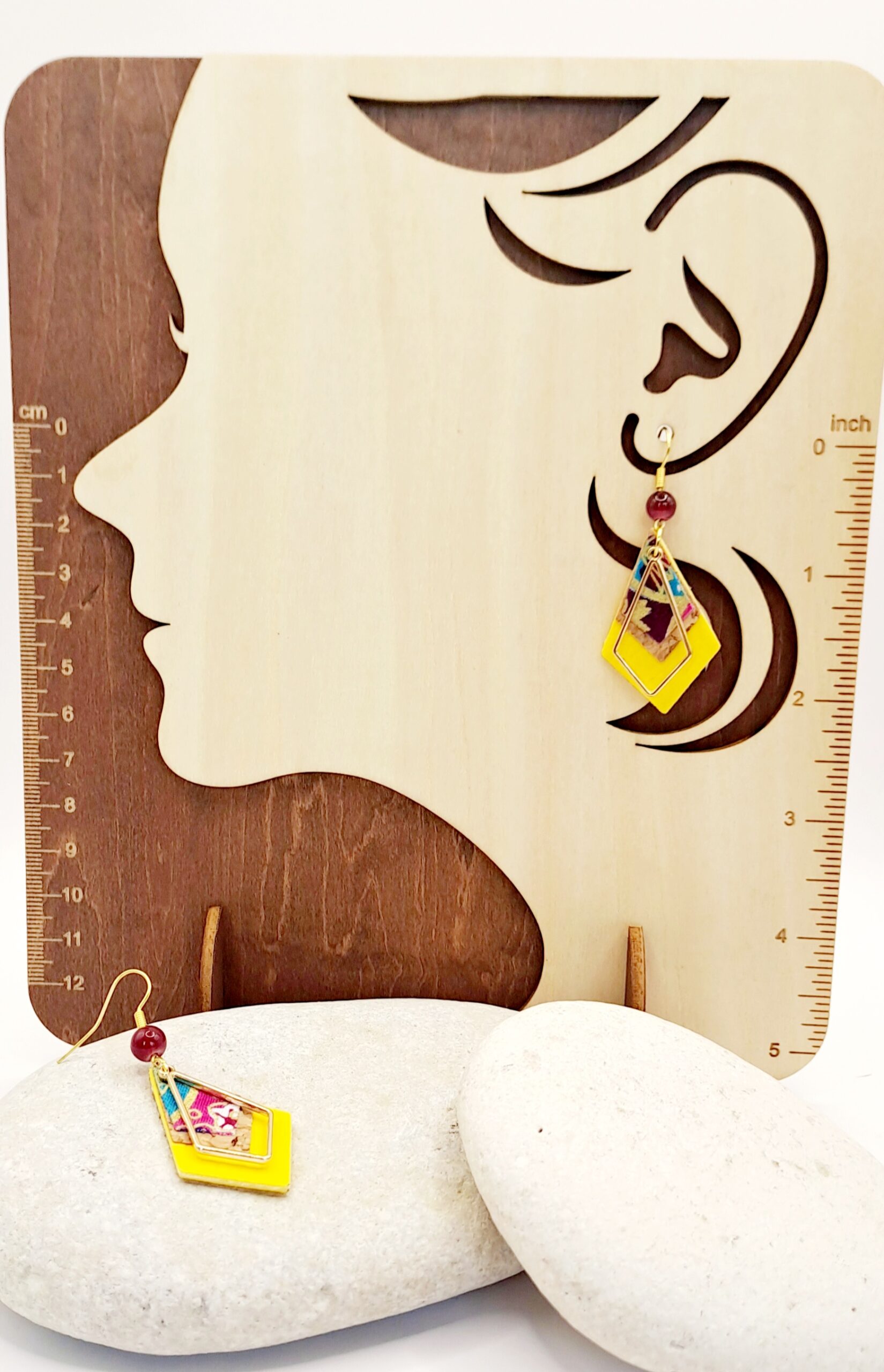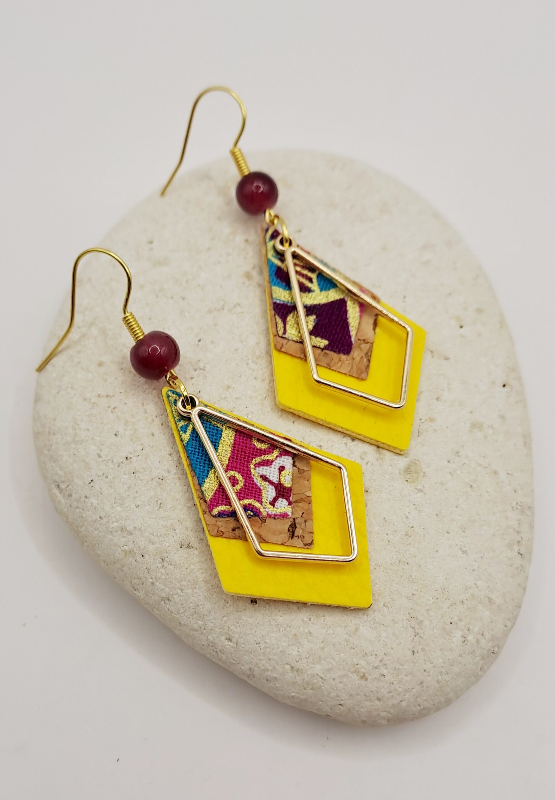 Boucles d’oreilles simili-cuir jaune / liège / papier imprimé / charme doré / perle / crochet or