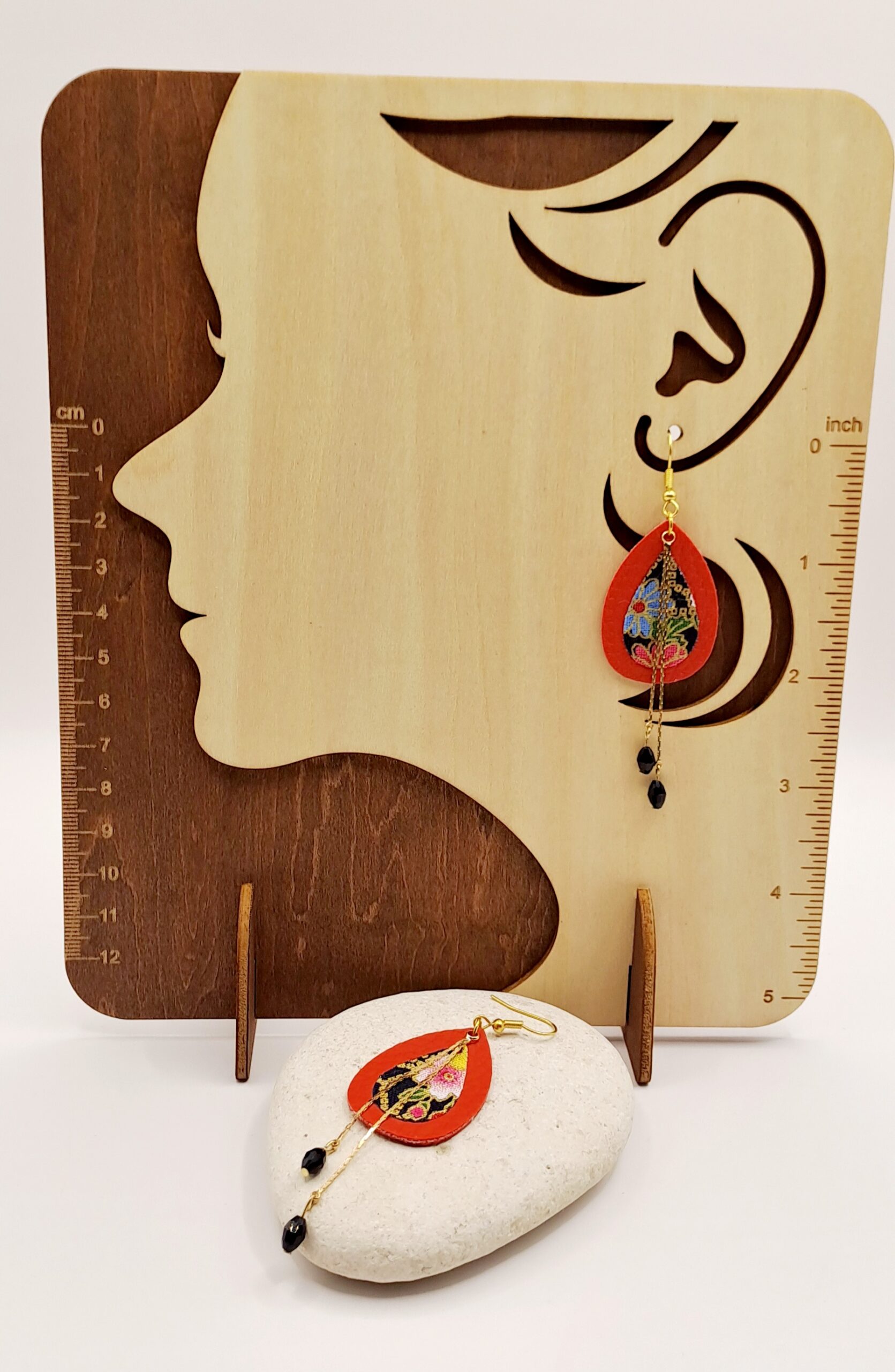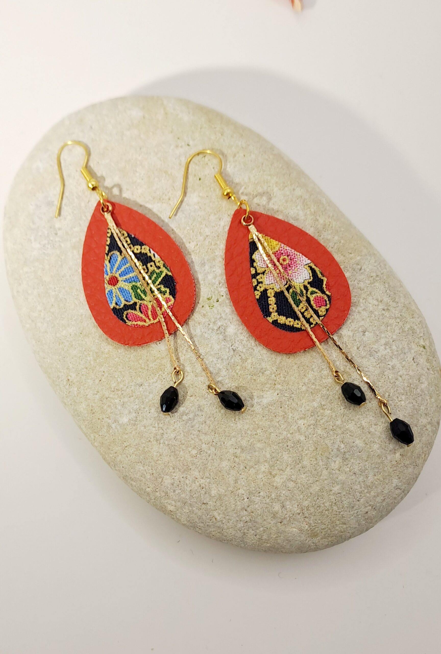 Boucles d’oreilles simili-cuir rouge / tissu imprimé / charme doré avec perles noir / crochet or