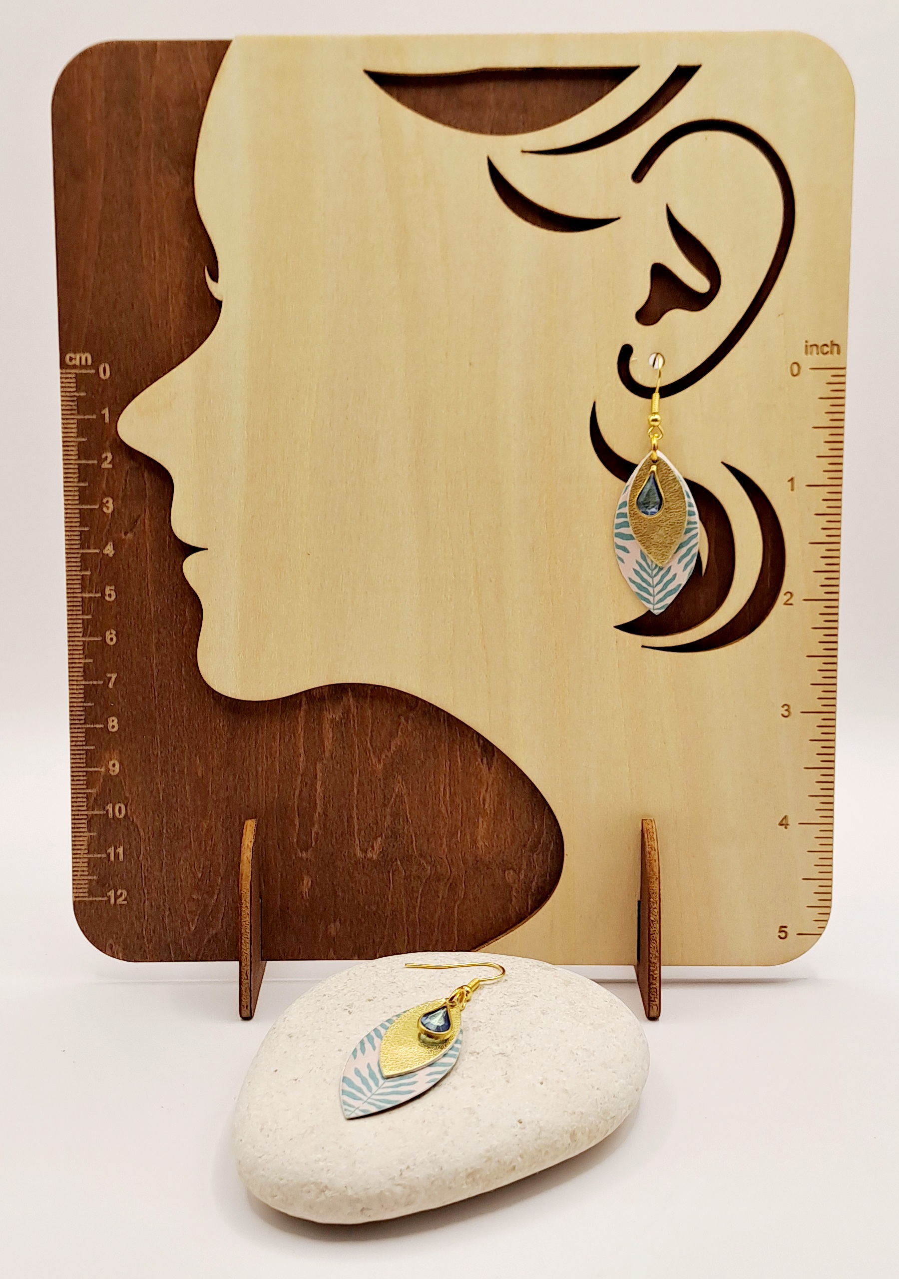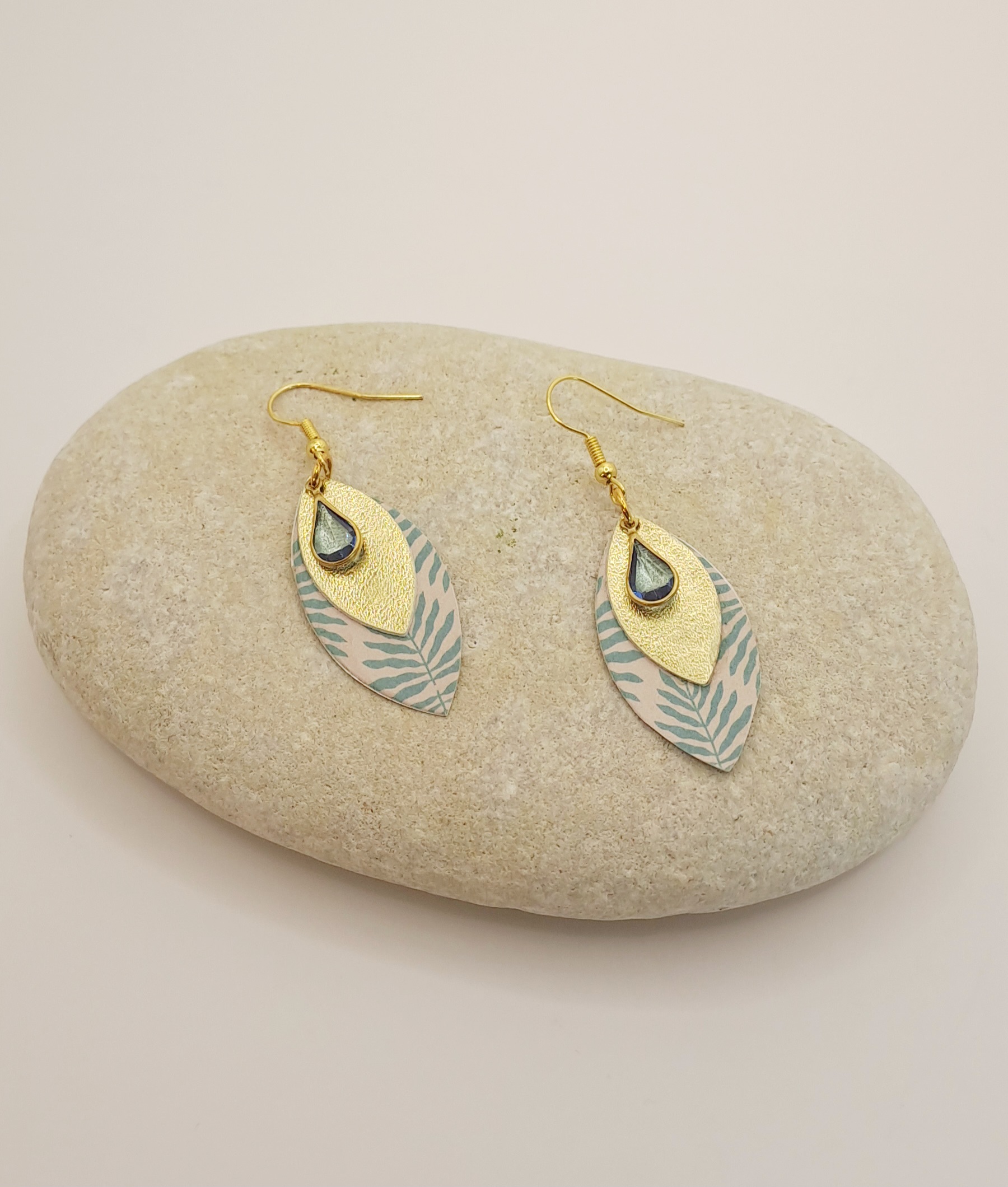 Boucles d’oreilles simili-cuir doré / tissu imprimé dur / charme doré avec pierre / crochet or