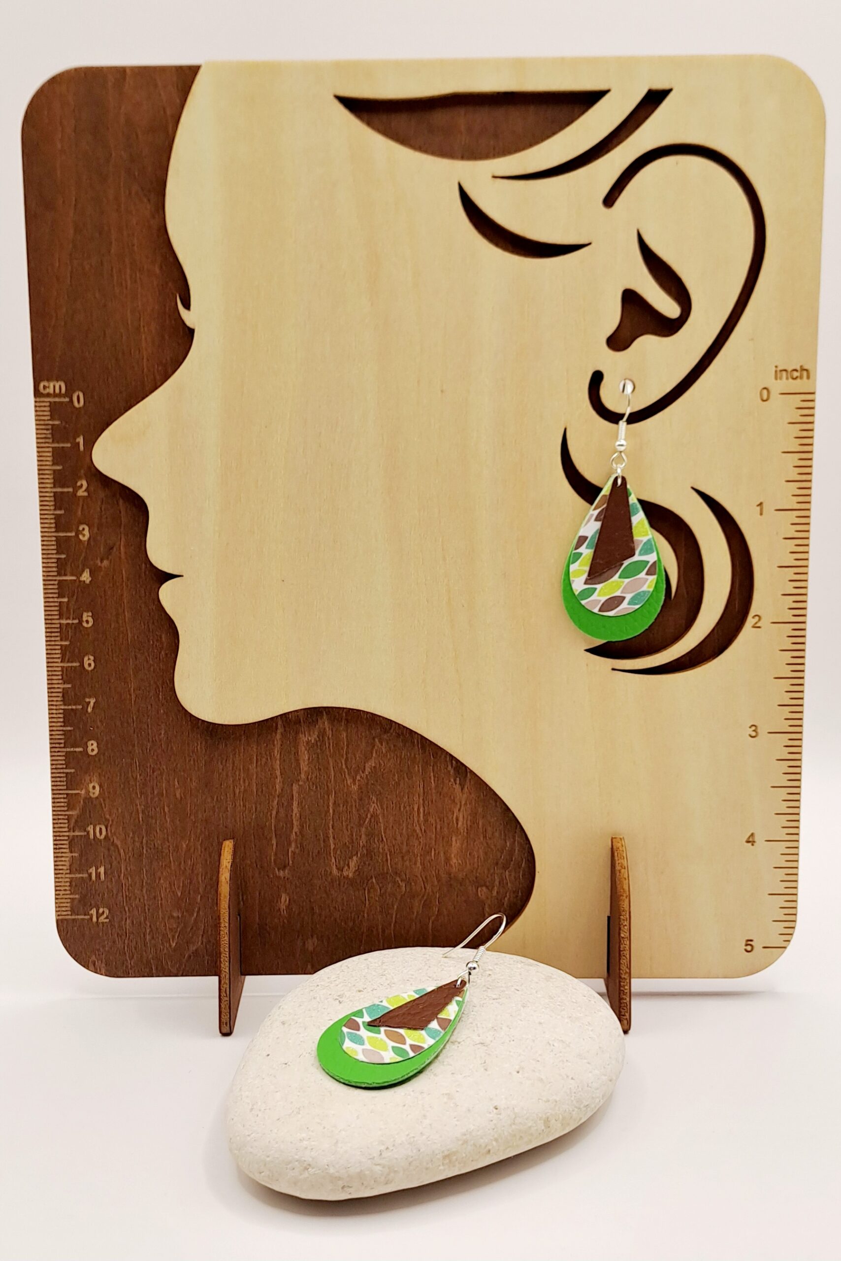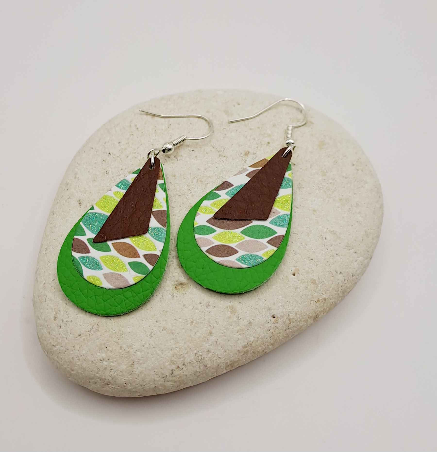 Boucles d’oreilles simili-cuir vert et marron / papier imprimé / crochet argent