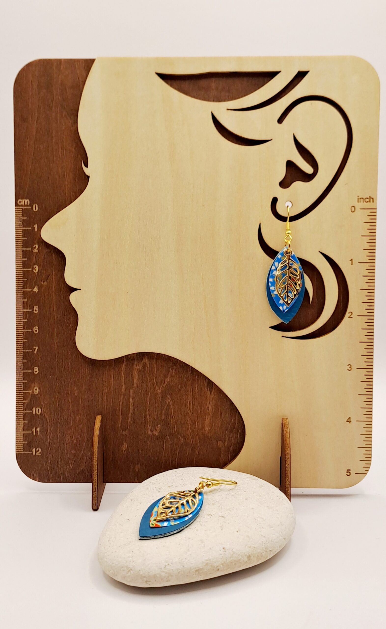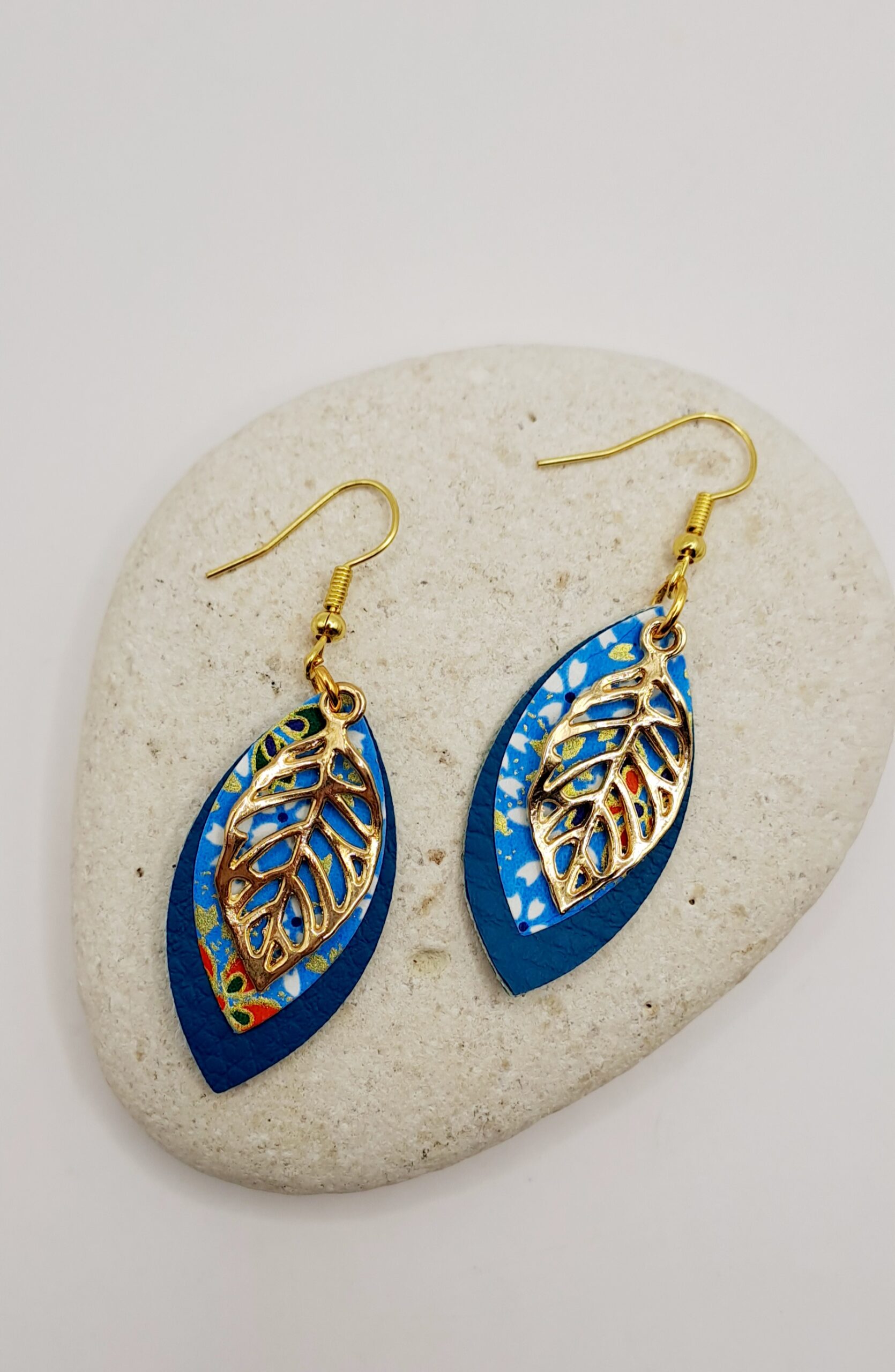 Boucles d’oreilles Simili-cuir bleu / papier imprimé fleur / feuille en d’orure / crochet or