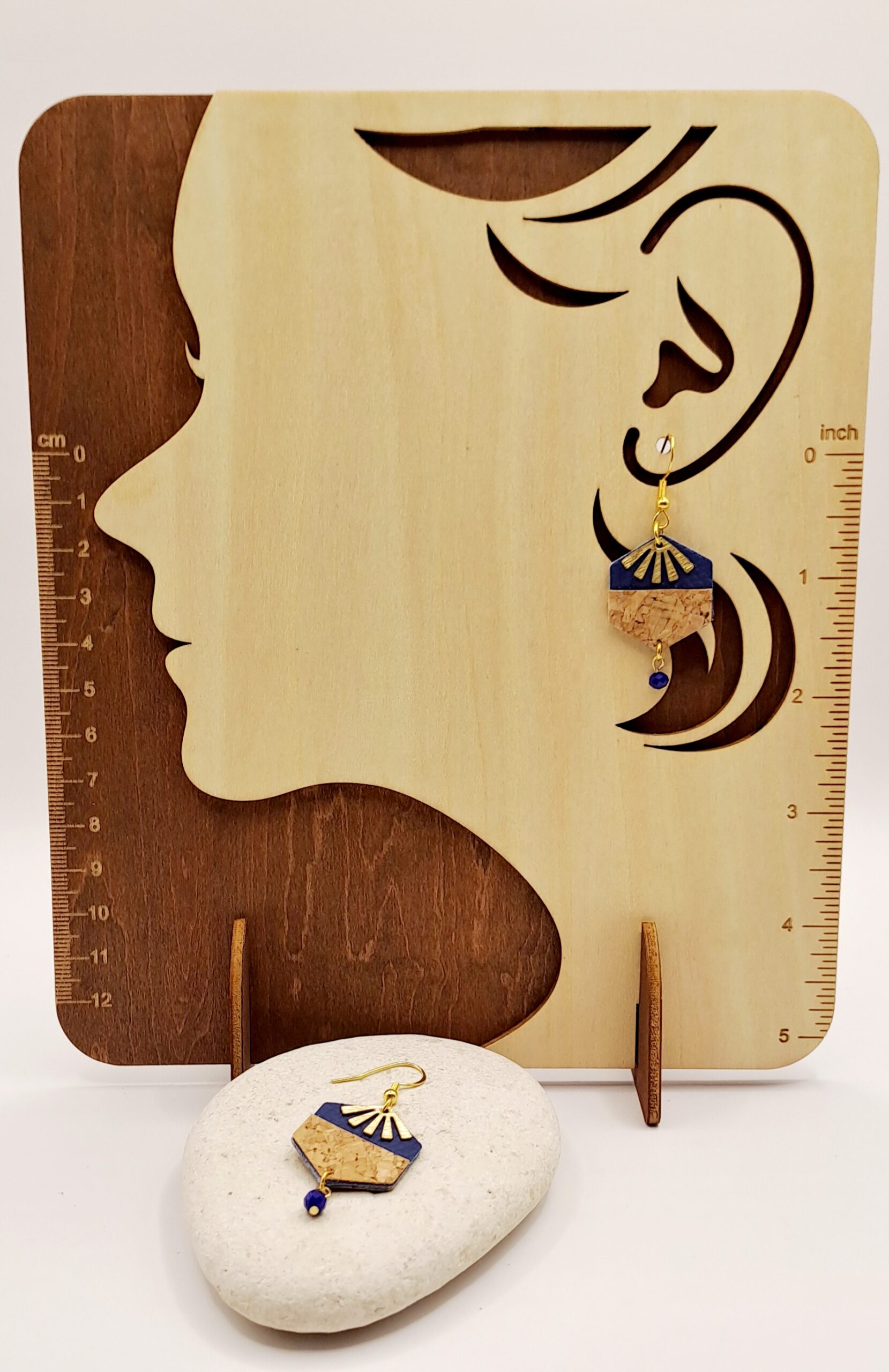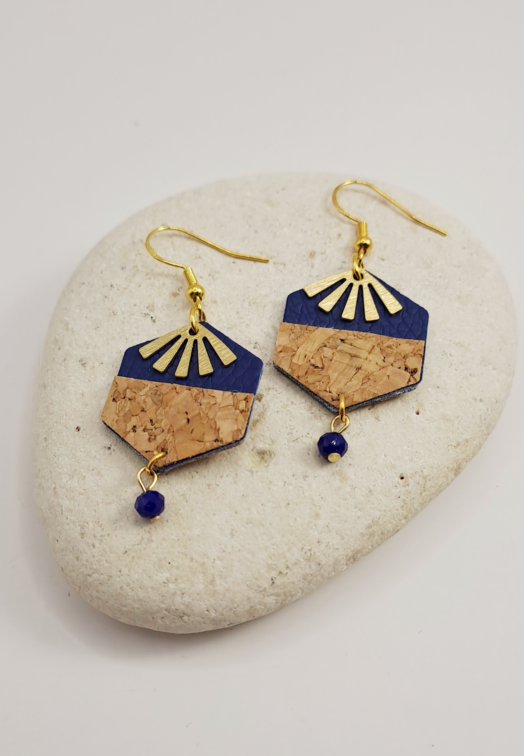 Boucles d’oreilles simili-cuir bleu / liège / charme doré / perle bleu / crochet or