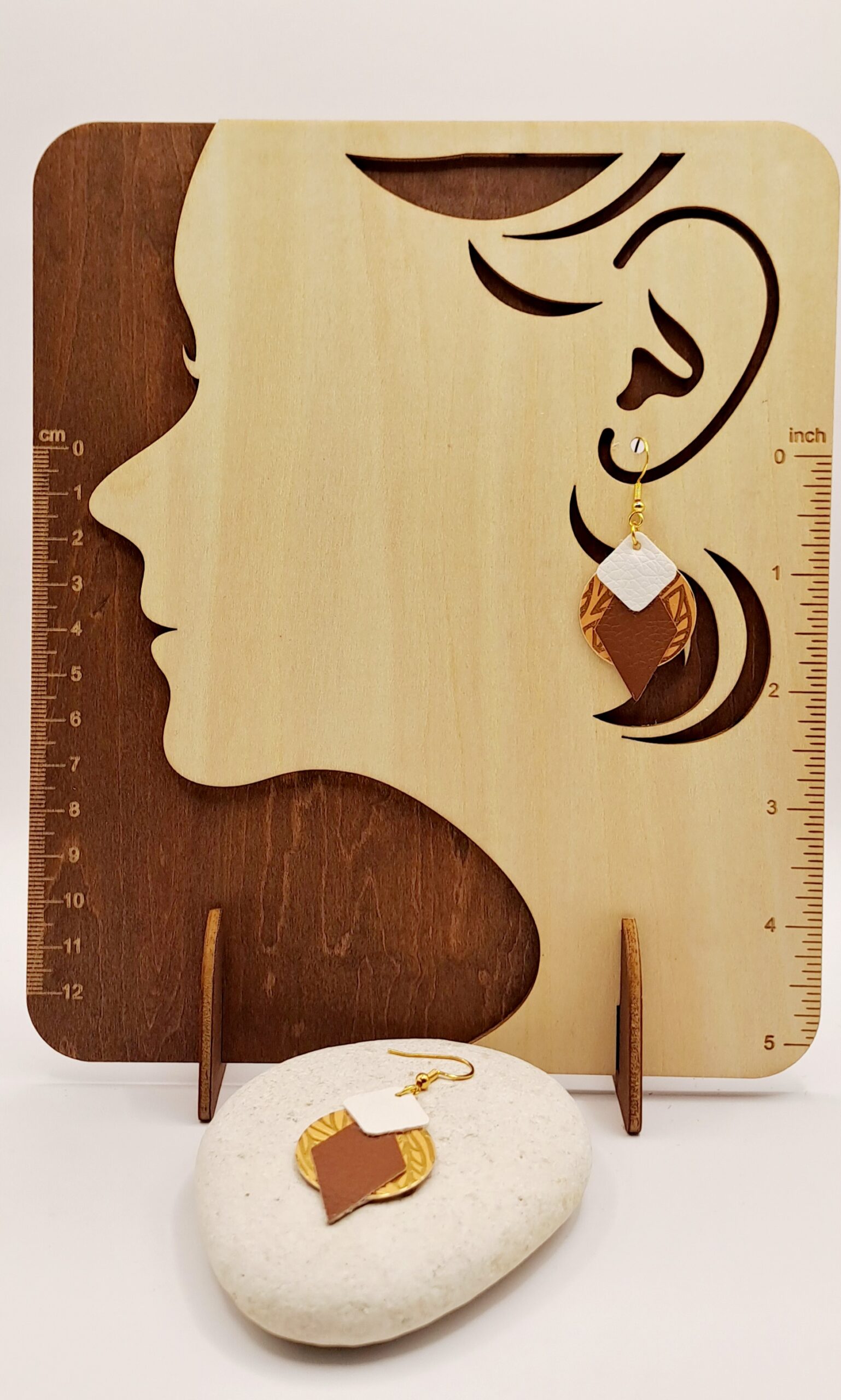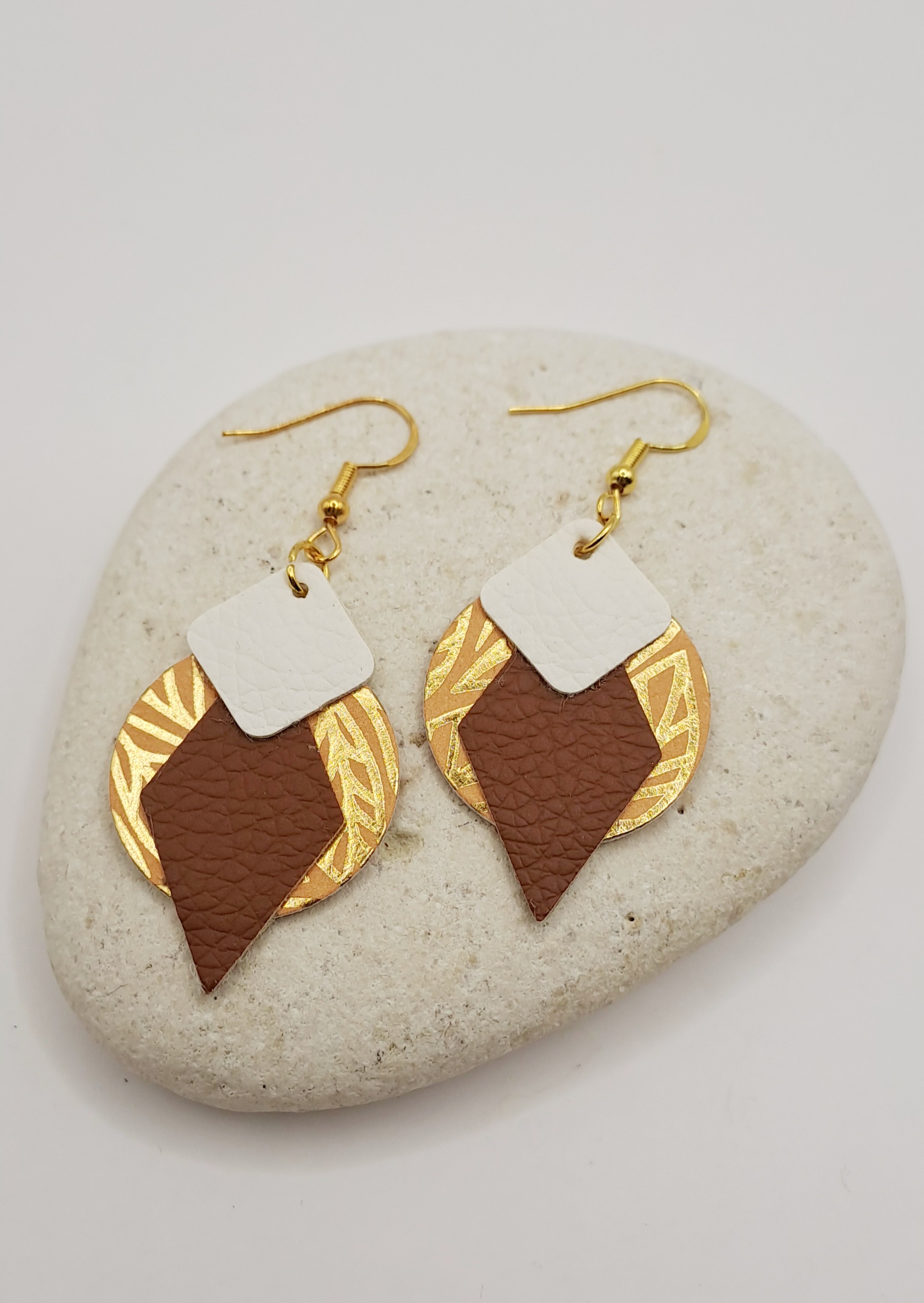 Boucles d’oreilles simili-cuir blanc et marron / papier imprimé dur/ crochet or