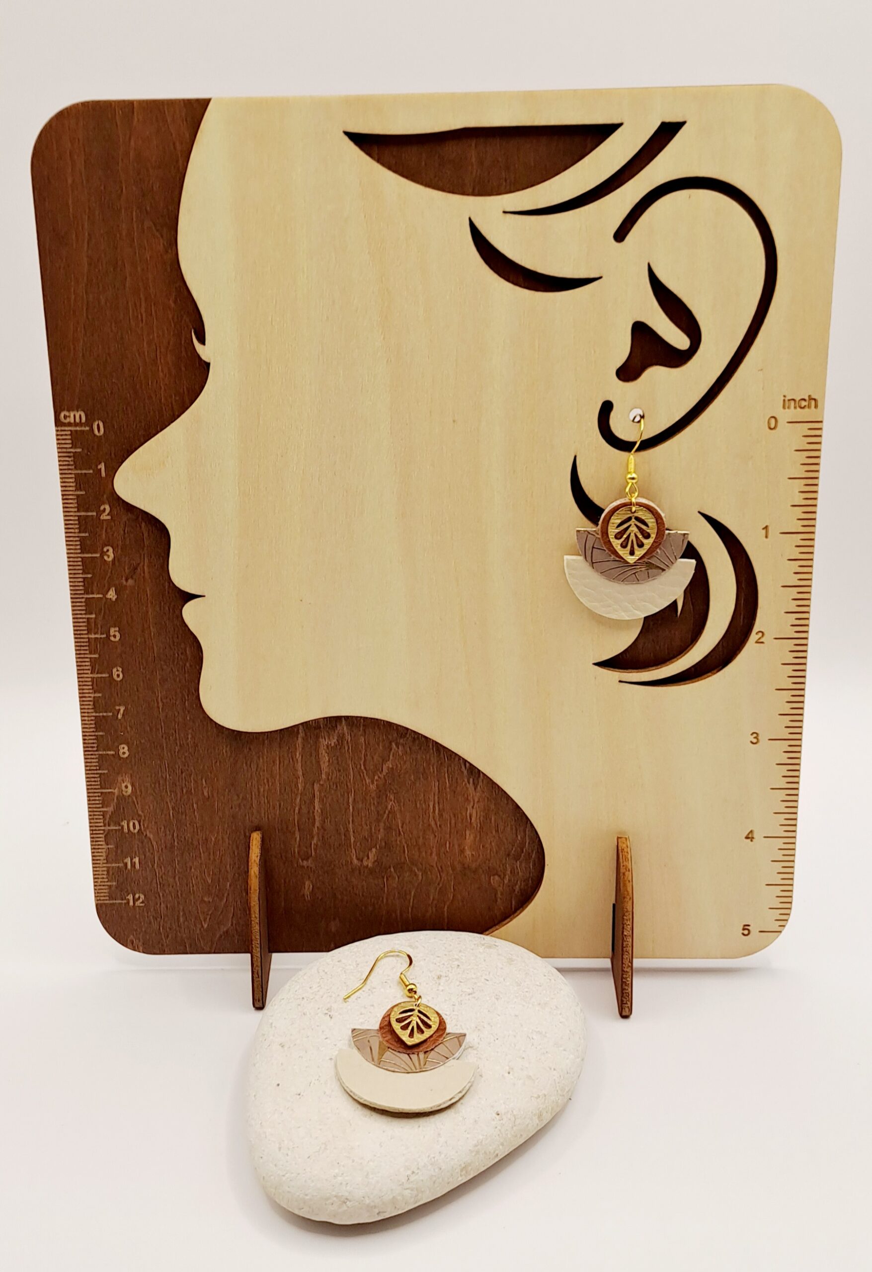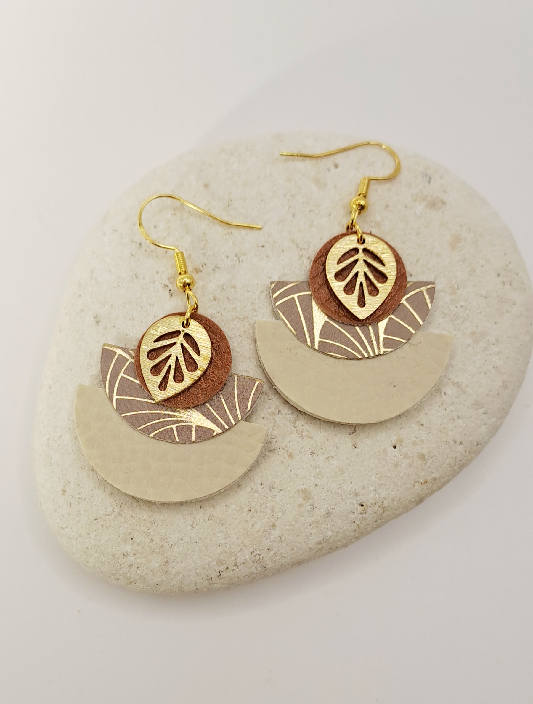 Boucles d’oreilles simili-cuir crème et marron / charme feuille doré / crochet or