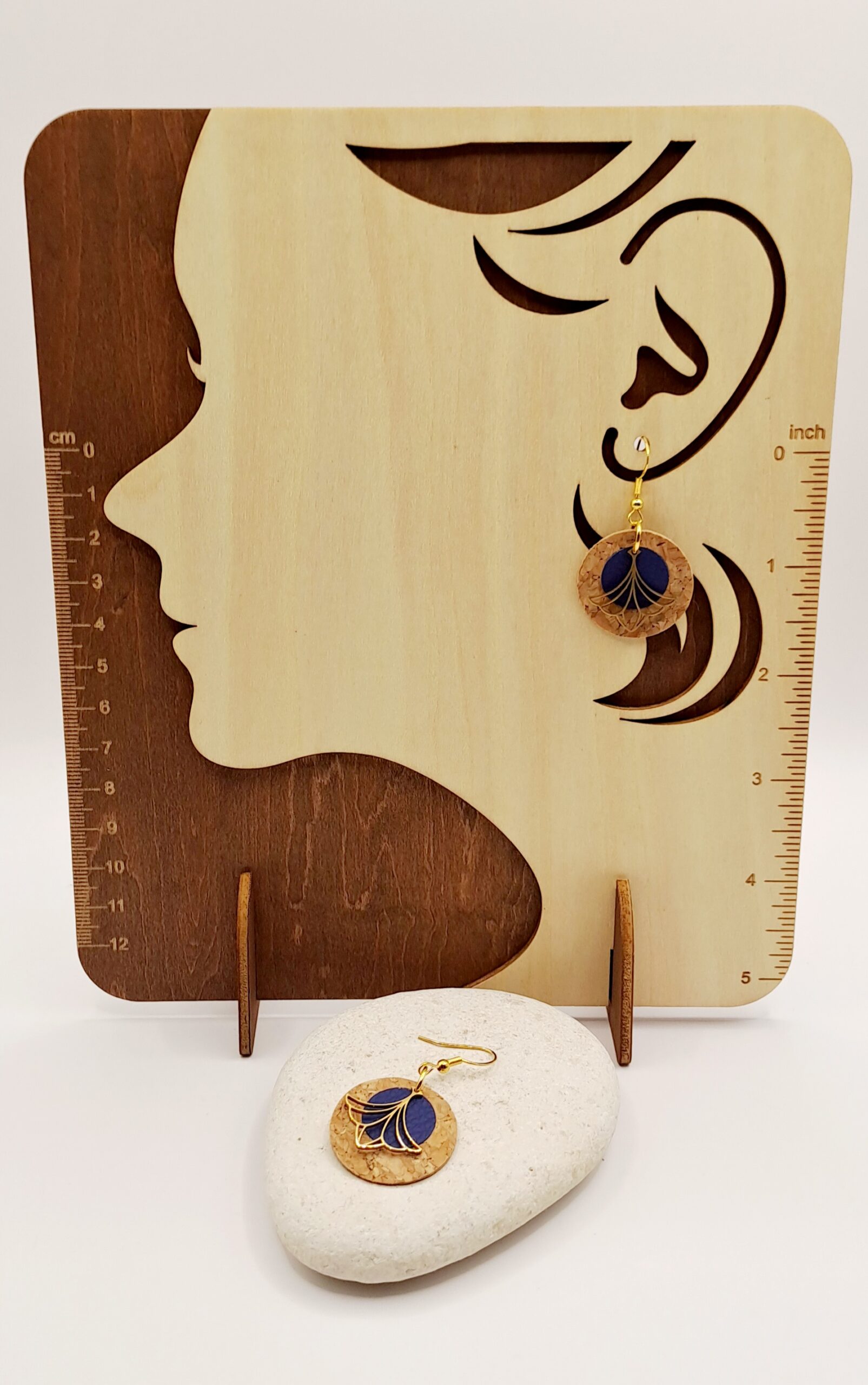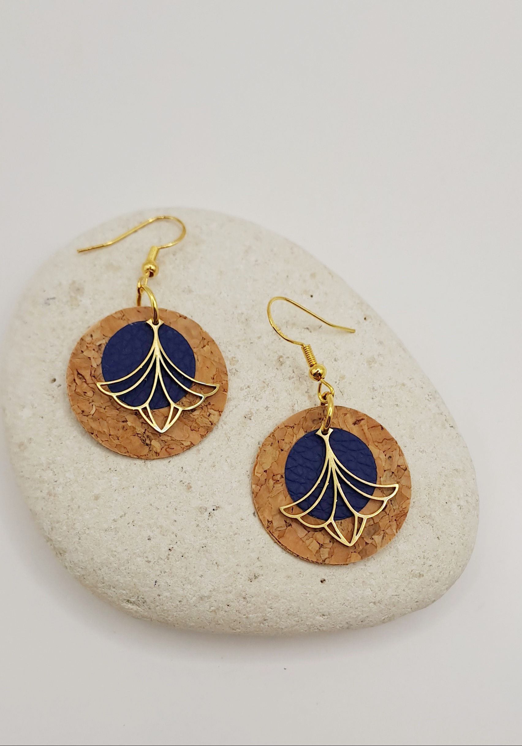 Boucles d’oreilles simili-cuir bleu / liège / charme doré / crochet or