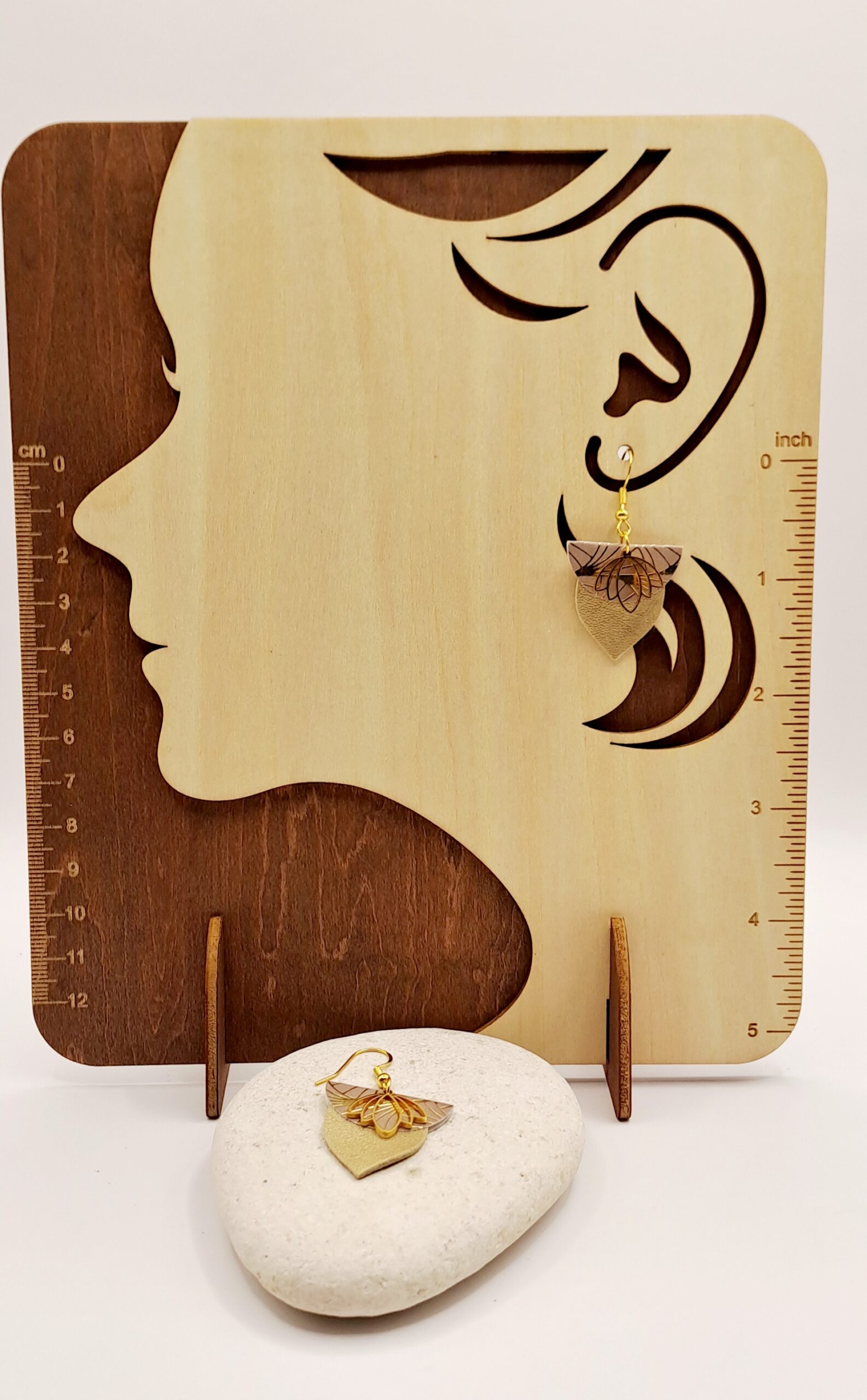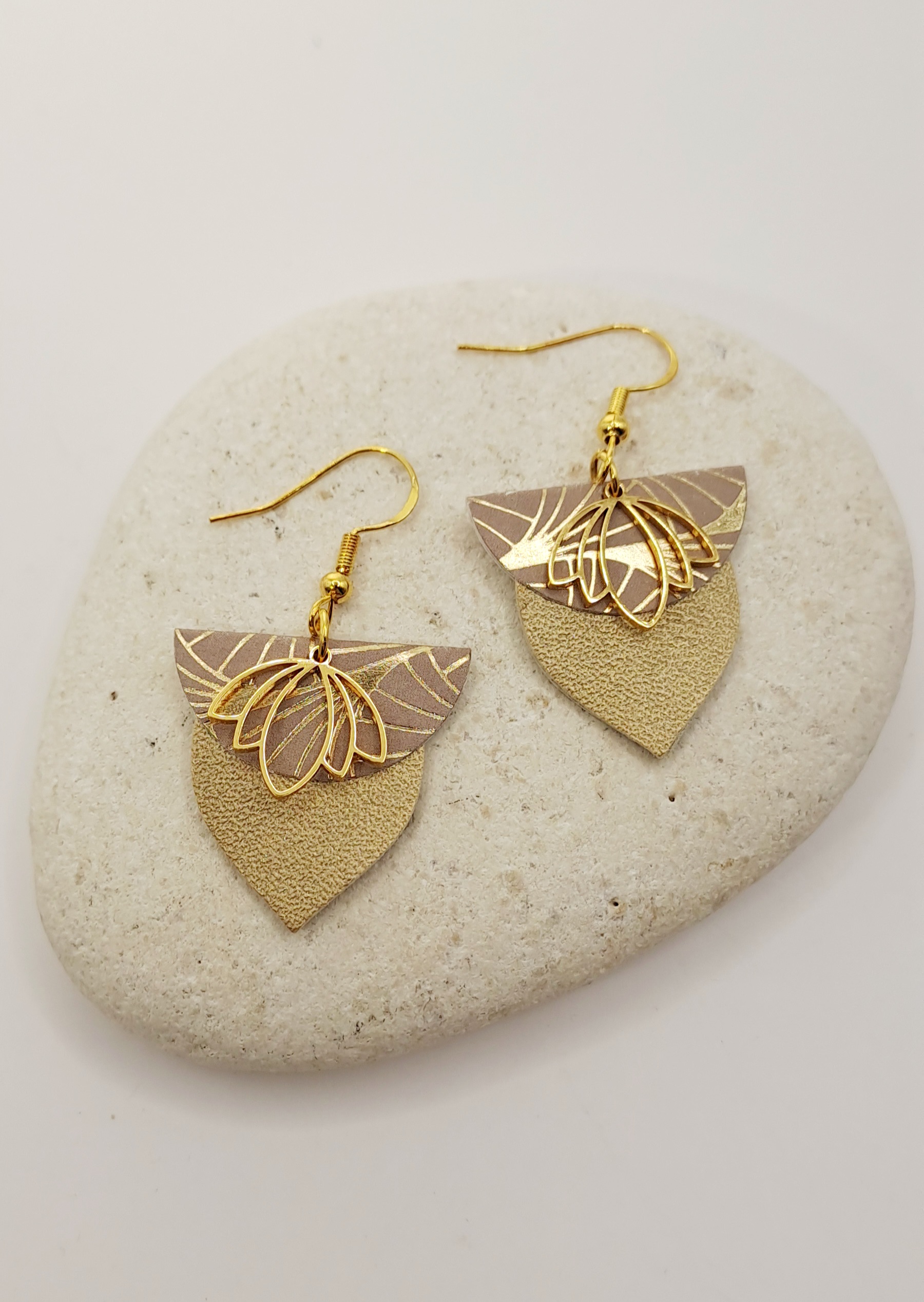 Boucles d’oreilles simili cuir crème / charme doré / crochet or