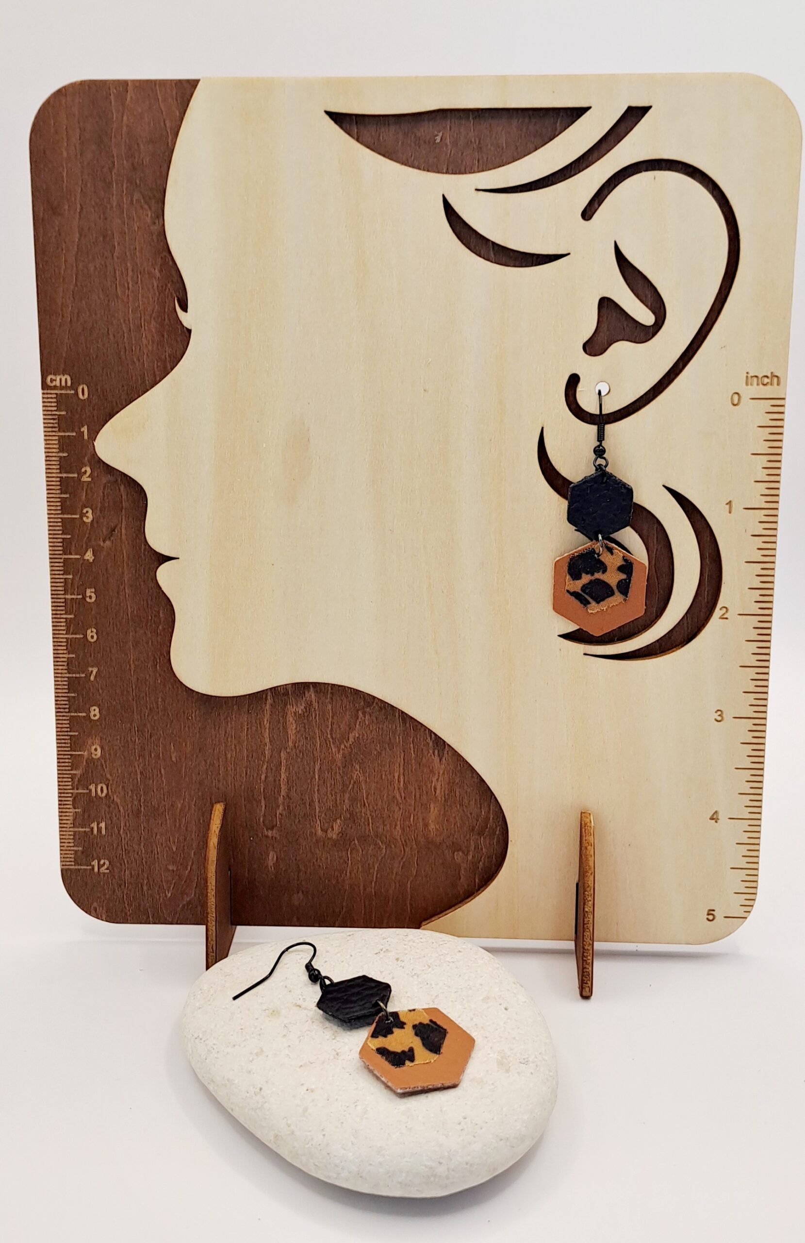 Boucles d’oreilles simili-cuir noir et marron / tissu imprimé / crochet noir
