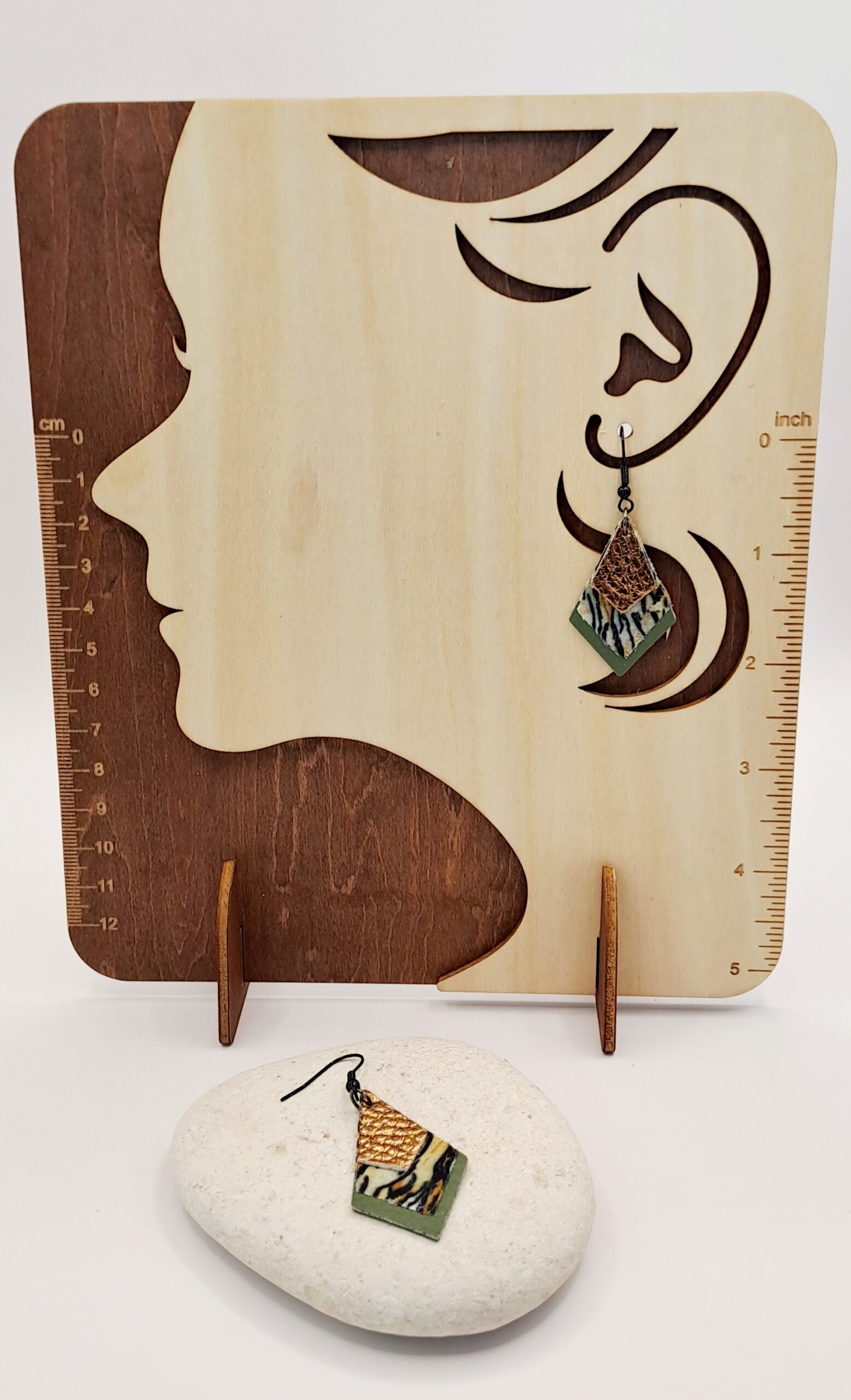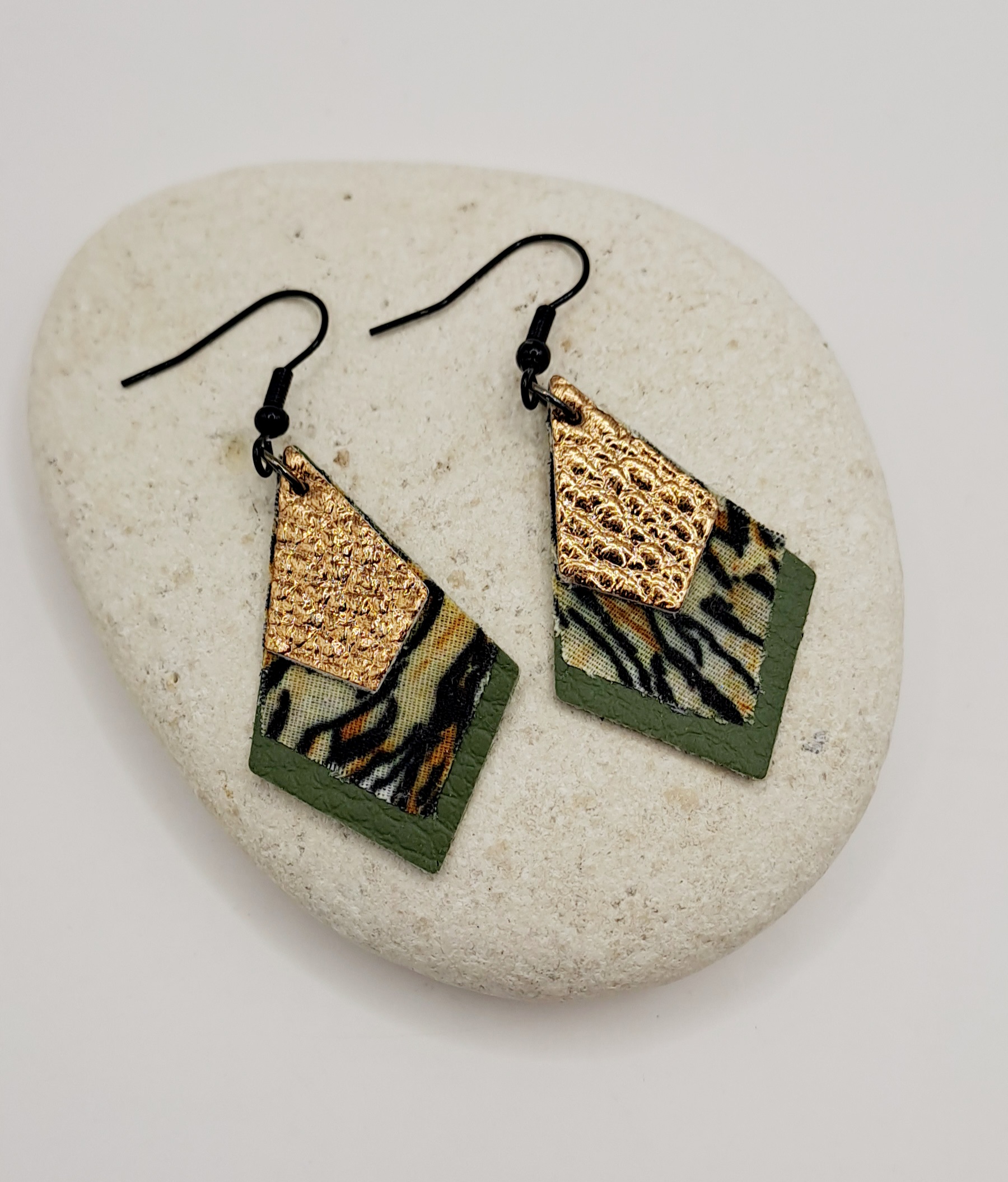 Boucles d’oreilles simili-cuir doré et vert / tissu imprimé / crochet noir