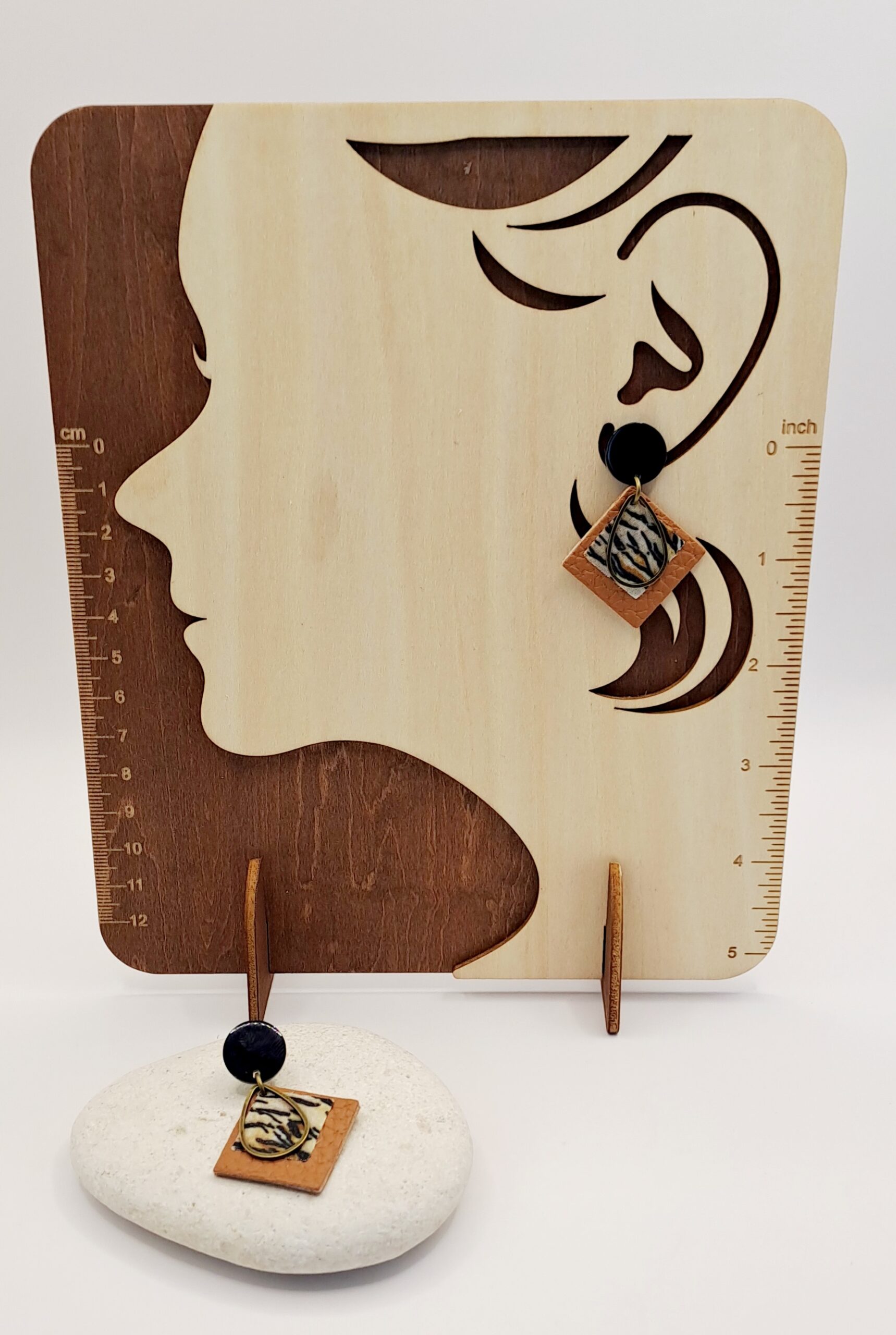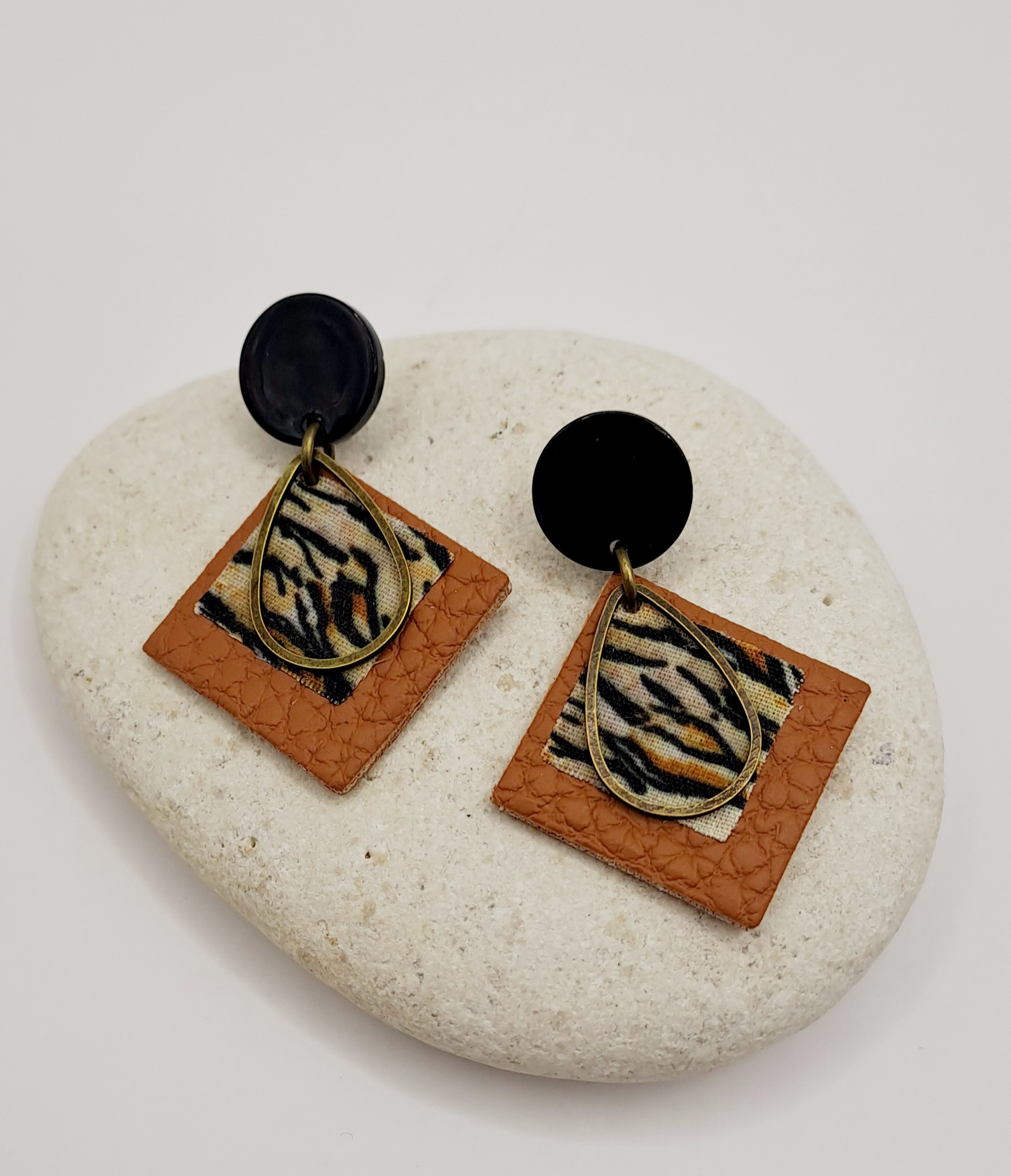 Boucles d’oreilles simili-cuir marron / tissu imprimé / charme bronze / clou noir