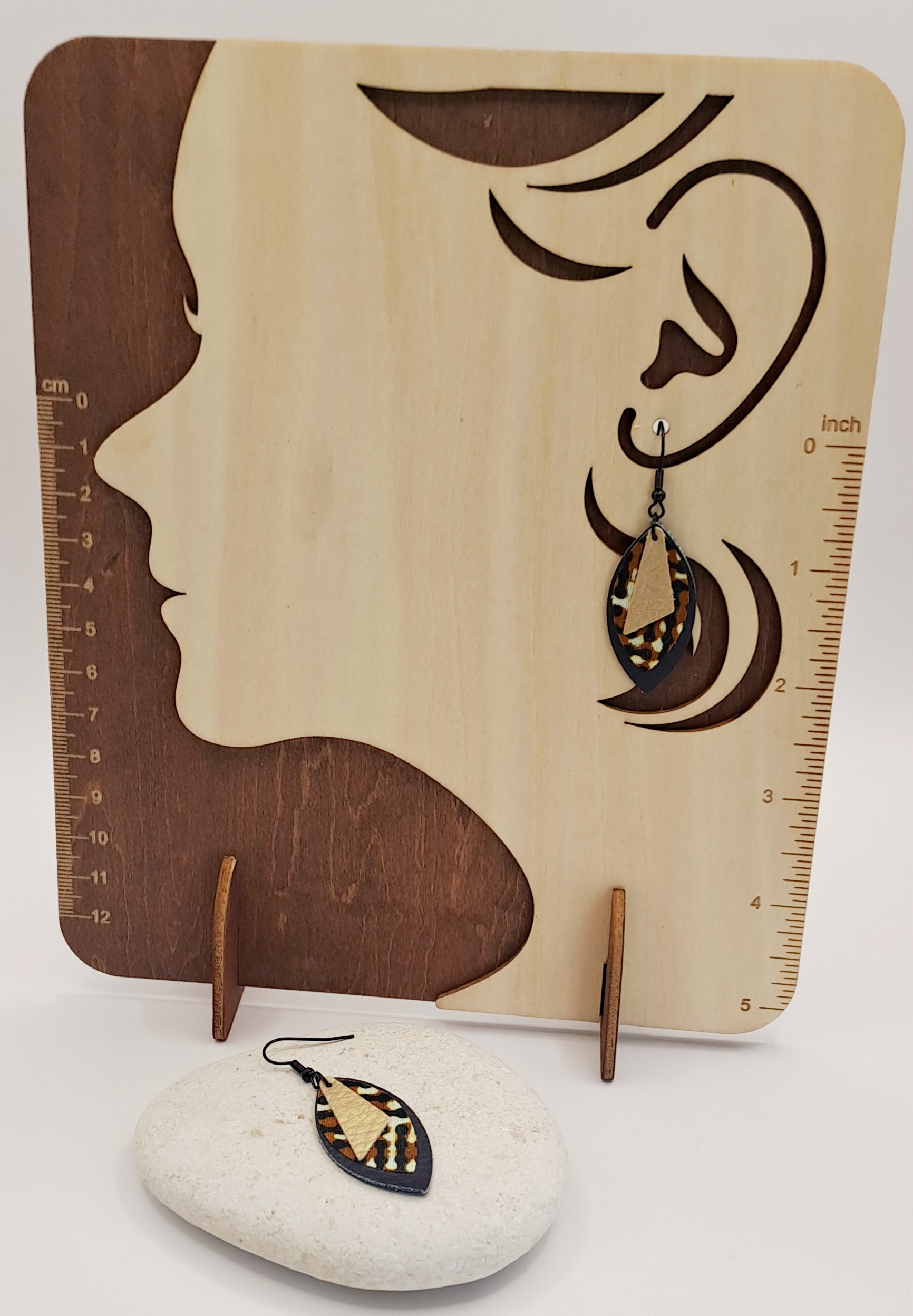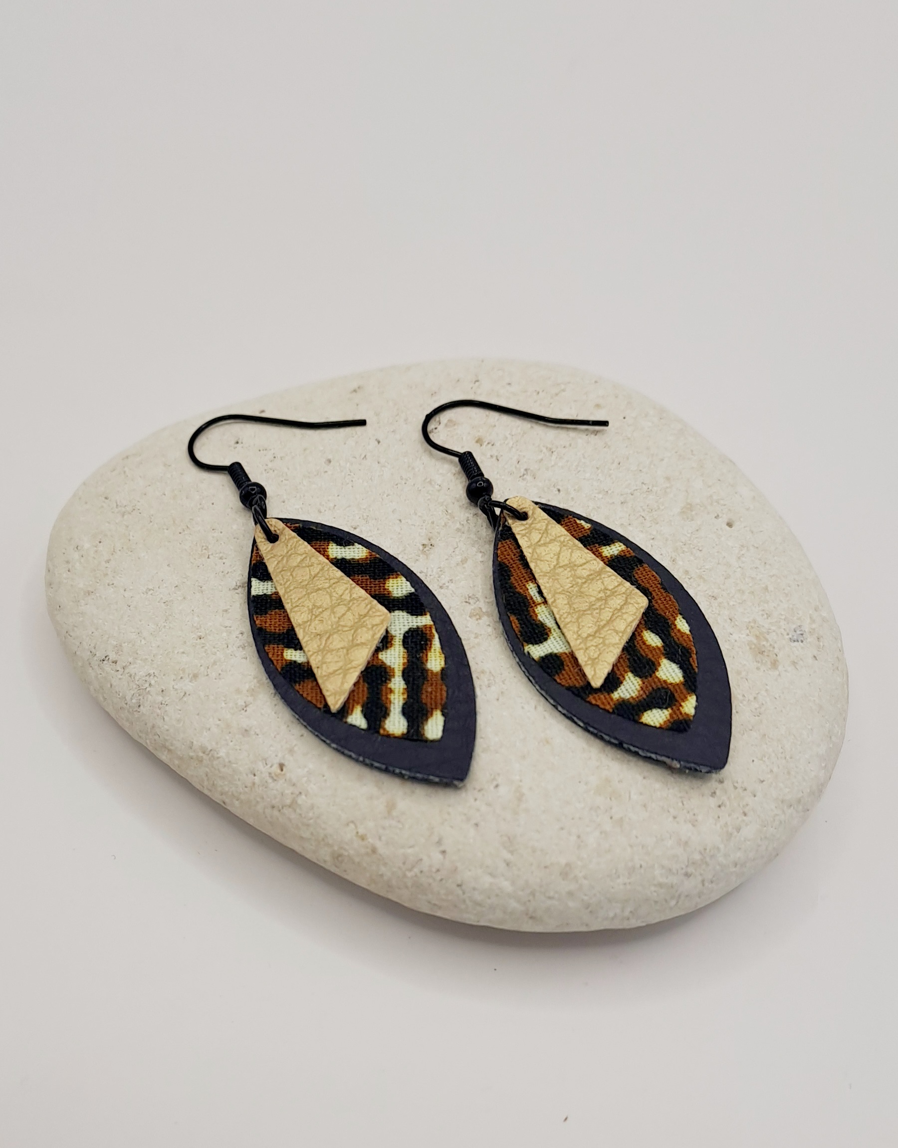 Boucles d’oreilles simili-cuir noir et doré / tissu imprimé / crochet noir